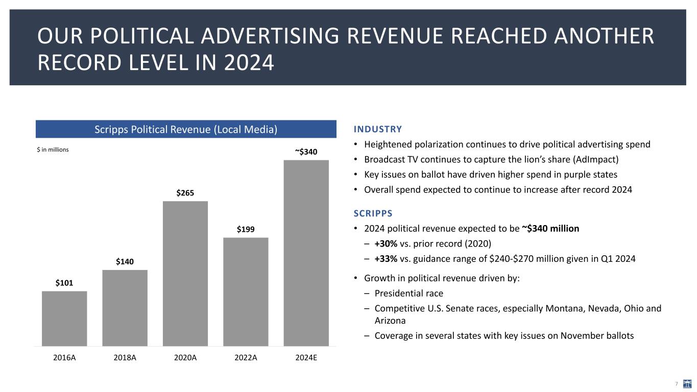 POLITICAL, RETRANS, SPORTS AND AUDIENCE REACH CONTINUE TO DRIVE OUR BUSINESS FORWARD 6 Record Political Advertising Revenue 1 Robust Retransmission Revenue2 Meaningful Upside From Securing Sports Rights 3 Diversified Distribution For an Evolving Consumer4 Largest U.S. Broadcaster By Household Reach5 Capital Allocation Policy Focused on Debt Reduction7 Significant Progress Toward Leverage Reduction8 Scripps’ spectrum reaches 72% of U.S. households Largest Holder of U.S. Broadcast Spectrum6