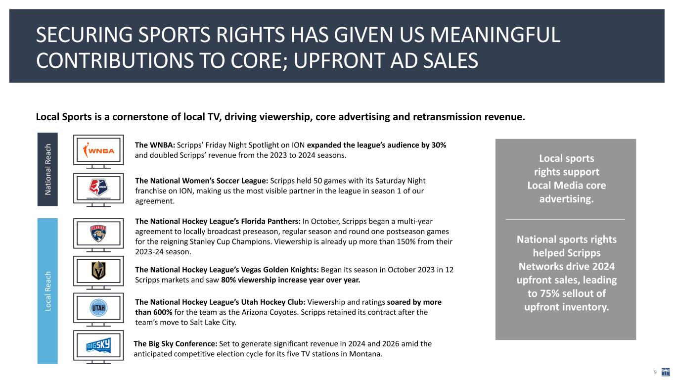 $31 $752 2012A 2013A 2014A 2015A 2016A 2017A 2018A 2019A 2020A 2021A 2022A 2023A ROBUST RETRANSMISSION REVENUE PROVIDES STRONG VISIBILITY AND GROWTH 8 Scripps Retransmission Revenue Network Affiliate Renewals $ in millions MVPD Renewal Schedule 2024 – 2026 2024: ~5% of pay TV households up for renewal 2025: ~20% of pay TV households up for renewal 2026: ~75% of pay TV households up for renewal 2024 2025 2026 11 stations 6 stations 4 stations 3 stations 18 stations