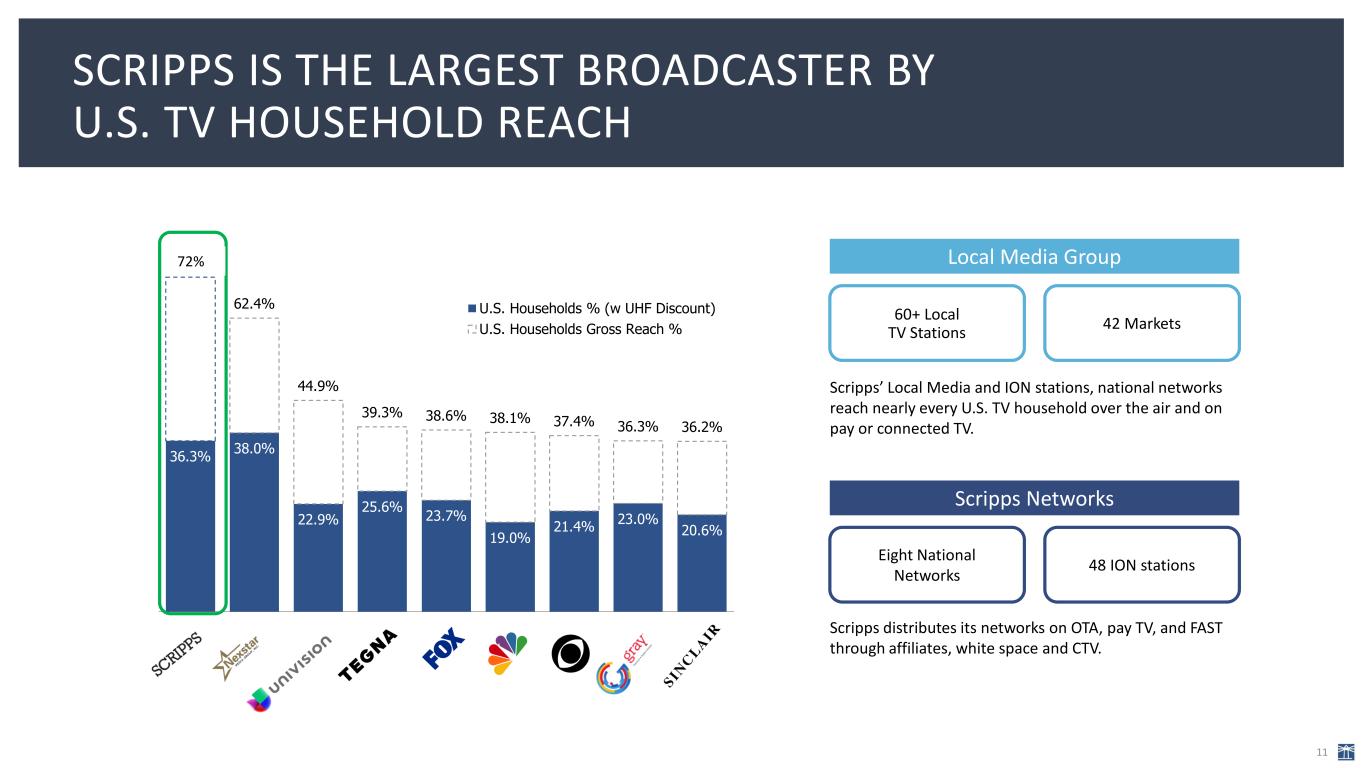 WE PROVIDE DIVERSIFIED DISTRIBUTION TO MEET CHANGING CONSUMER TV VIEWING HABITS 10 YouTubeTV     Samsung TV Plus        Vizio WatchFree+        Roku Channel        Xumo        Tubi        FuboTV        TCL        FreeVee        Pluto     PLUS Scripps News is no longer broadcast over the air but maintains its full connected TV/streaming platform distribution along with the related CTV revenue. Total networks CTV revenue is guided to up high-single-digits in 2024.
