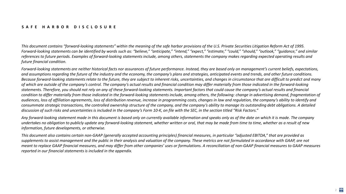 S A F E H A R B O R D I S C L O S U R E This document contains “forward-looking statements” within the meaning of the safe harbor provisions of the U.S. Private Securities Litigation Reform Act of 1995. Forward-looking statements can be identified by words such as: “believe,” “anticipate,” “intend,” “expect,” “estimate,” “could,” “should,” “outlook,” “guidance,” and similar references to future periods. Examples of forward-looking statements include, among others, statements the company makes regarding expected operating results and future financial condition. Forward-looking statements are neither historical facts nor assurances of future performance. Instead, they are based only on management’s current beliefs, expectations, and assumptions regarding the future of the industry and the economy, the company’s plans and strategies, anticipated events and trends, and other future conditions. Because forward-looking statements relate to the future, they are subject to inherent risks, uncertainties, and changes in circumstance that are difficult to predict and many of which are outside of the company’s control. The company’s actual results and financial condition may differ materially from those indicated in the forward-looking statements. Therefore, you should not rely on any of these forward-looking statements. Important factors that could cause the company’s actual results and financial condition to differ materially from those indicated in the forward-looking statements include, among others, the following: change in advertising demand, fragmentation of audiences, loss of affiliation agreements, loss of distribution revenue, increase in programming costs, changes in law and regulation, the company’s ability to identify and consummate strategic transactions, the controlled ownership structure of the company, and the company’s ability to manage its outstanding debt obligations. A detailed discussion of such risks and uncertainties is included in the company’s Form 10-K, on file with the SEC, in the section titled “Risk Factors.” Any forward-looking statement made in this document is based only on currently available information and speaks only as of the date on which it is made. The company undertakes no obligation to publicly update any forward-looking statement, whether written or oral, that may be made from time to time, whether as a result of new information, future developments, or otherwise. This document also contains certain non-GAAP (generally accepted accounting principles) financial measures, in particular “adjusted EBITDA,” that are provided as supplements to assist management and the public in their analysis and valuation of the company. These metrics are not formulated in accordance with GAAP, are not meant to replace GAAP financial measures, and may differ from other companies’ uses or formulations. A reconciliation of non-GAAP financial measures to GAAP measures reported in our financial statements is included in the appendix. 2