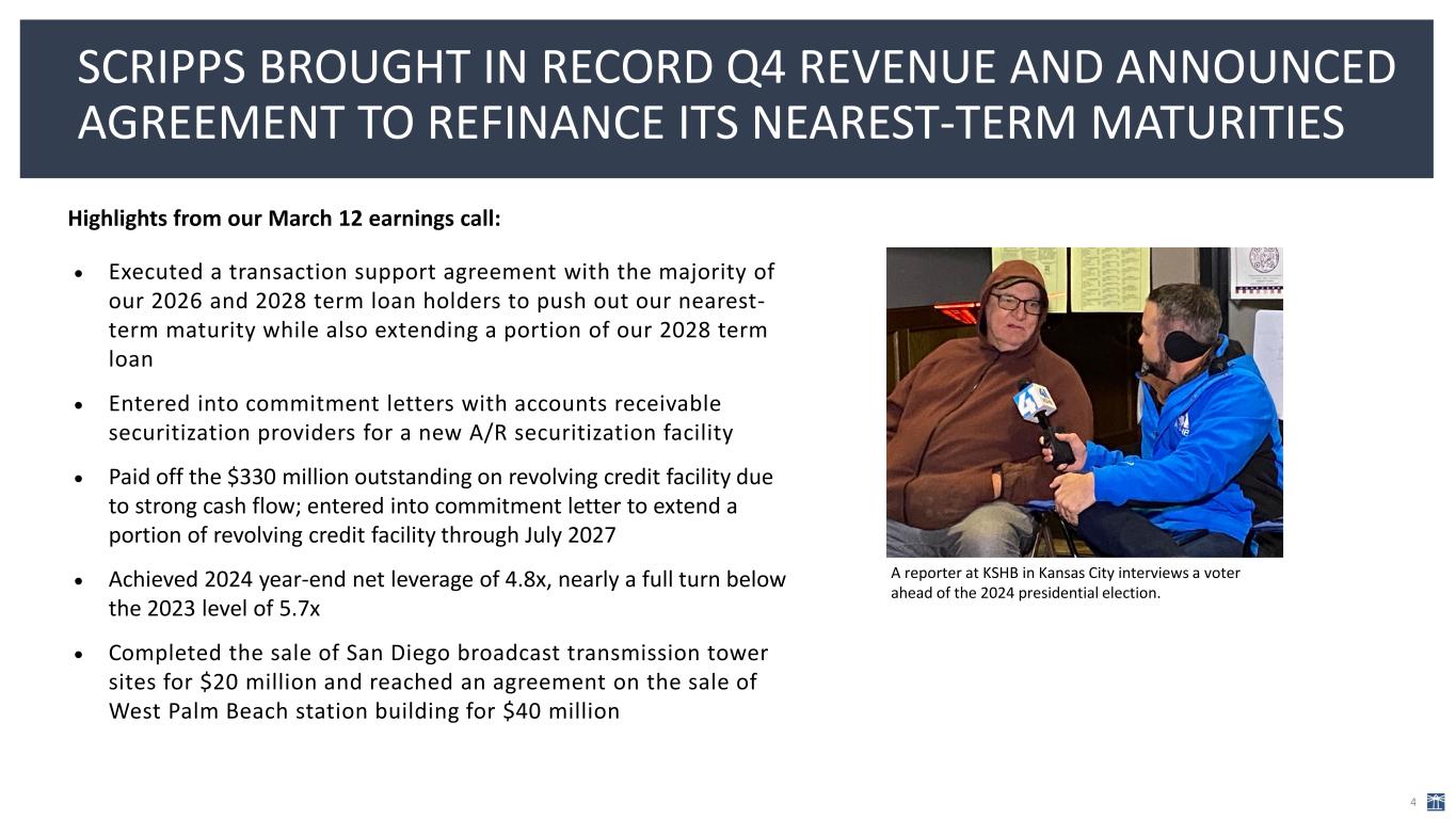 Highlights from our March 12 earnings call: • Executed a transaction support agreement with the majority of our 2026 and 2028 term loan holders to push out our nearest- term maturity while also extending a portion of our 2028 term loan • Entered into commitment letters with accounts receivable securitization providers for a new A/R securitization facility • Paid off the $330 million outstanding on revolving credit facility due to strong cash flow; entered into commitment letter to extend a portion of revolving credit facility through July 2027 • Achieved 2024 year-end net leverage of 4.8x, nearly a full turn below the 2023 level of 5.7x • Completed the sale of San Diego broadcast transmission tower sites for $20 million and reached an agreement on the sale of West Palm Beach station building for $40 million SCRIPPS BROUGHT IN RECORD Q4 REVENUE AND ANNOUNCED AGREEMENT TO REFINANCE ITS NEAREST-TERM MATURITIES 4 A reporter at KSHB in Kansas City interviews a voter ahead of the 2024 presidential election.