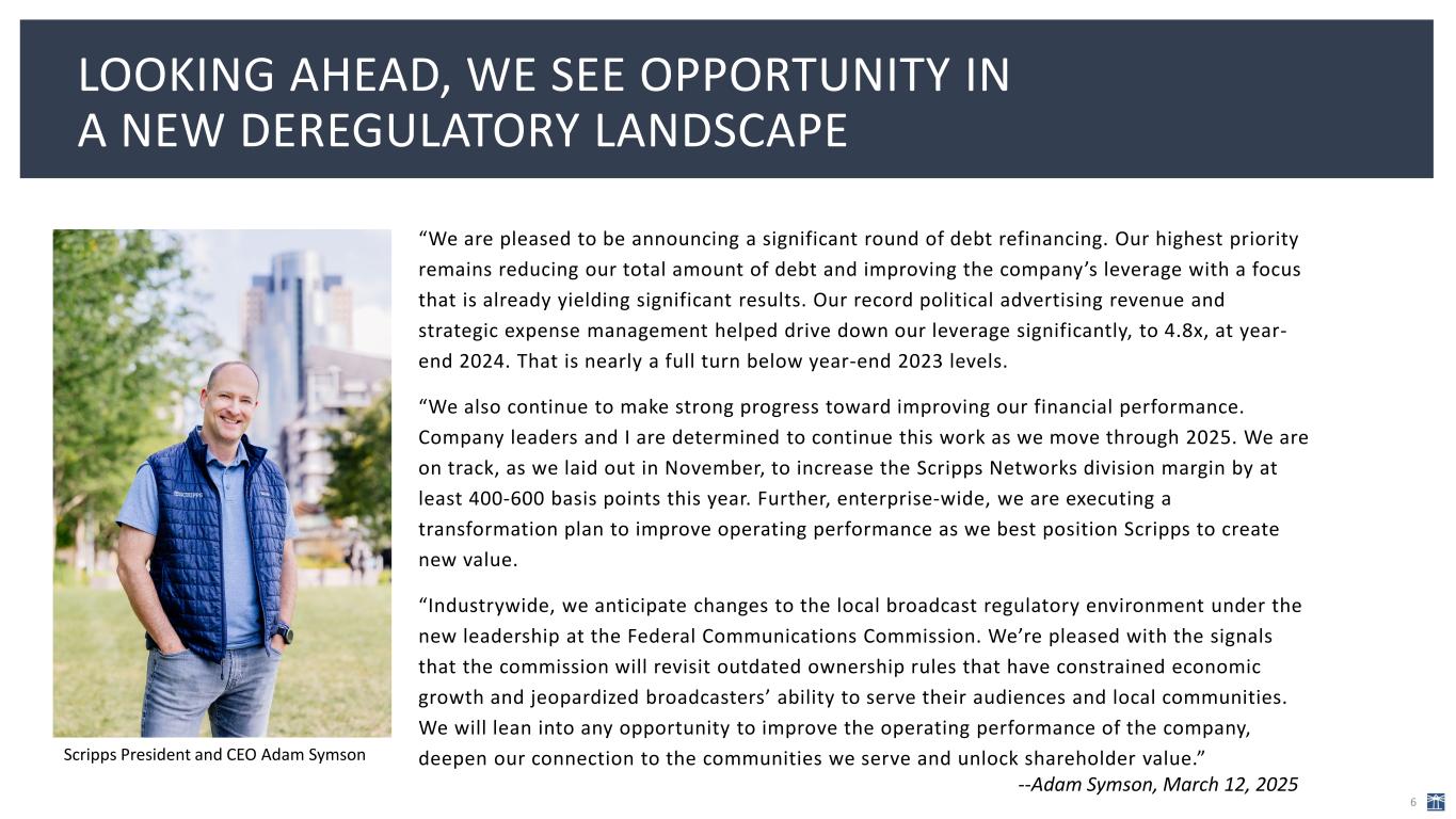 Other financial highlights: • Received a record $343 million in Local Media division presidential- election year political revenue, reinforcing the value of local broadcast brands for campaigns and candidates in tightly contested swing states • Tightly controlled costs in the Scripps Networks division, resulting in a 6.3% decrease in fourth-quarter expenses YOY, even with a non-recurring charge that impacted the margin by several percentage points • Completed new multi-year affiliation agreements with NBC and CBS • Executed cost savings in Scripps Networks that will result in a 400-600 basis-point improvement in the division’s margin for 2025 and beyond • Signed a new multi-year agreement to broadcast the WNBA championship team Las Vegas Aces. This is Scripps Sports’ fifth full- season partnership with a major-league team or conference at the local level. It also has multi-season agreements to broadcast the WNBA (now in year 3) and the National Women’s Soccer League on ION (now in year 2). THE COMPANY ACHIEVED YEAR-END NET LEVERAGE OF 4.8X, NEARLY A FULL TURN BELOW YEAR-END 2023 5 On March 13, Scripps announced it had signed the championship WNBA team Las Vegas Aces to a multi-year, full-season broadcast partnership.