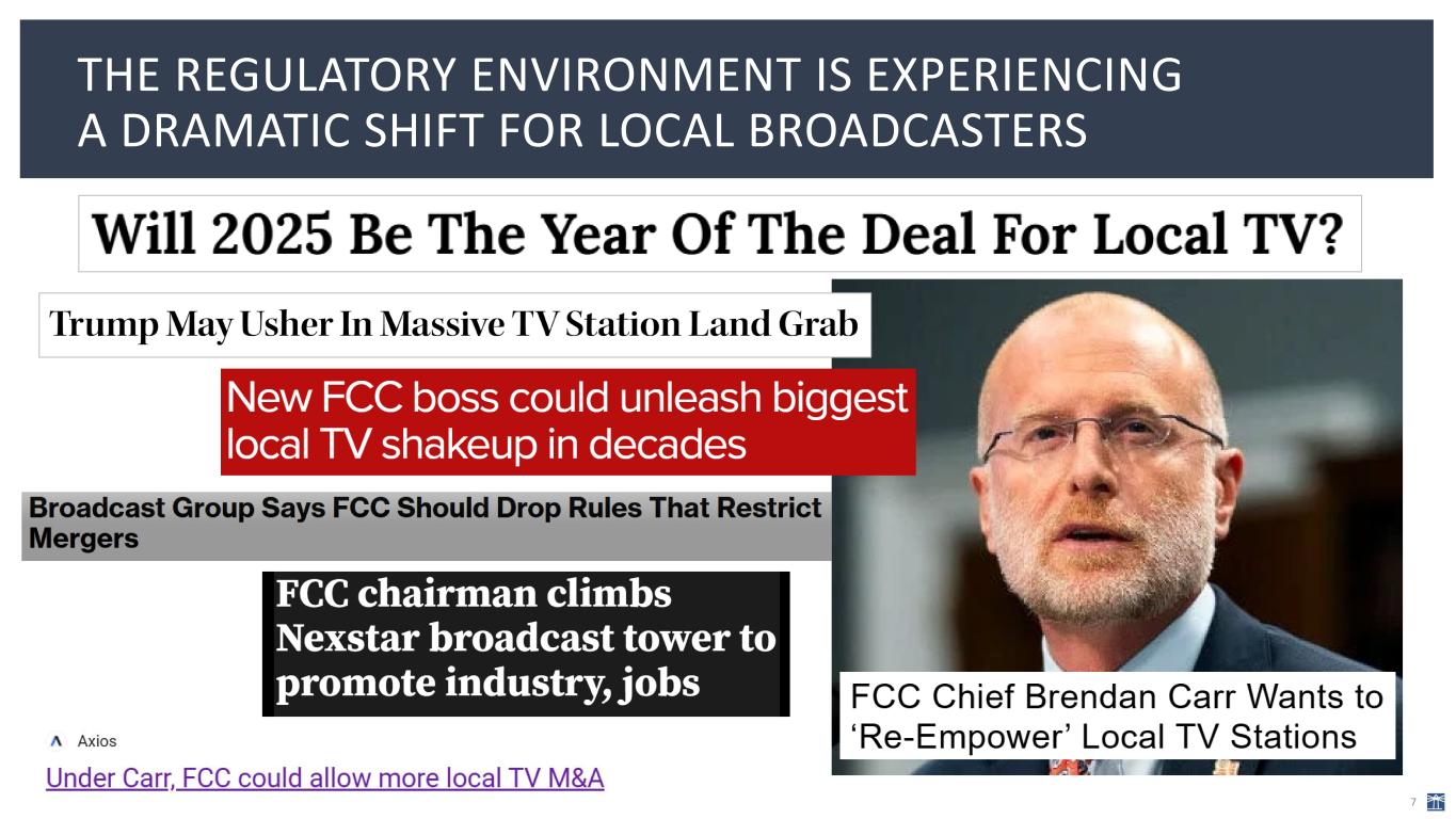 LOOKING AHEAD, WE SEE OPPORTUNITY IN A NEW DEREGULATORY LANDSCAPE 6 “We are pleased to be announcing a significant round of debt refinancing. Our highest priority remains reducing our total amount of debt and improving the company’s leverage with a focus that is already yielding significant results. Our record political advertising revenue and strategic expense management helped drive down our leverage significantly, to 4.8x, at year- end 2024. That is nearly a full turn below year-end 2023 levels. “We also continue to make strong progress toward improving our financial performance. Company leaders and I are determined to continue this work as we move through 2025. We are on track, as we laid out in November, to increase the Scripps Networks division margin by at least 400-600 basis points this year. Further, enterprise-wide, we are executing a transformation plan to improve operating performance as we best position Scripps to create new value. “Industrywide, we anticipate changes to the local broadcast regulatory environment under the new leadership at the Federal Communications Commission. We’re pleased with the signals that the commission will revisit outdated ownership rules that have constrained economic growth and jeopardized broadcasters’ ability to serve their audiences and local communities. We will lean into any opportunity to improve the operating performance of the company, deepen our connection to the communities we serve and unlock shareholder value.”Scripps President and CEO Adam Symson --Adam Symson, March 12, 2025