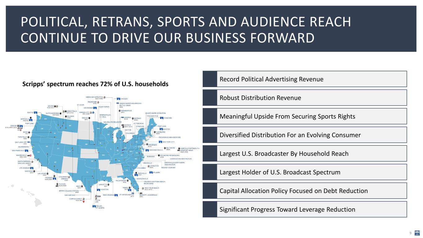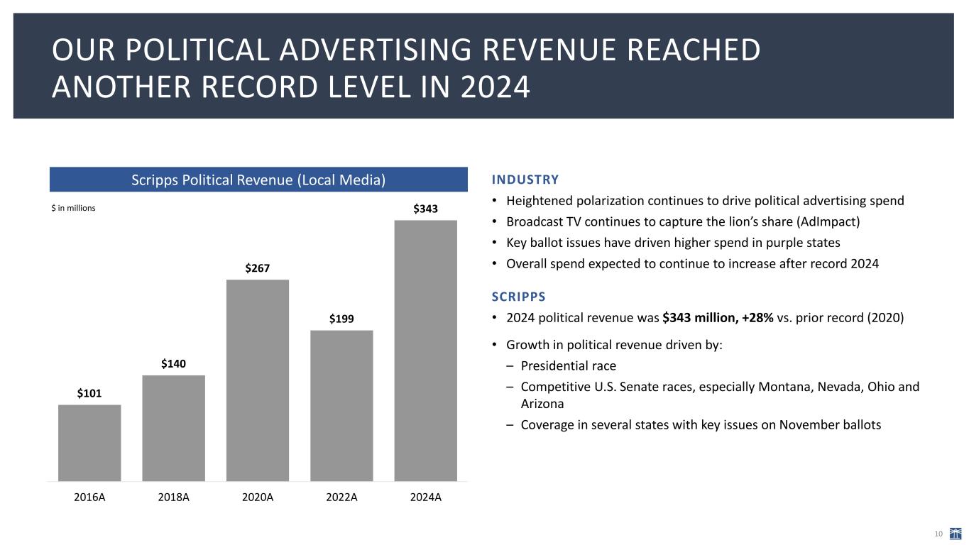 POLITICAL, RETRANS, SPORTS AND AUDIENCE REACH CONTINUE TO DRIVE OUR BUSINESS FORWARD 9 Record Political Advertising Revenue Robust Distribution Revenue Meaningful Upside From Securing Sports Rights Diversified Distribution For an Evolving Consumer Largest U.S. Broadcaster By Household Reach Capital Allocation Policy Focused on Debt Reduction Significant Progress Toward Leverage Reduction Scripps’ spectrum reaches 72% of U.S. households Largest Holder of U.S. Broadcast Spectrum