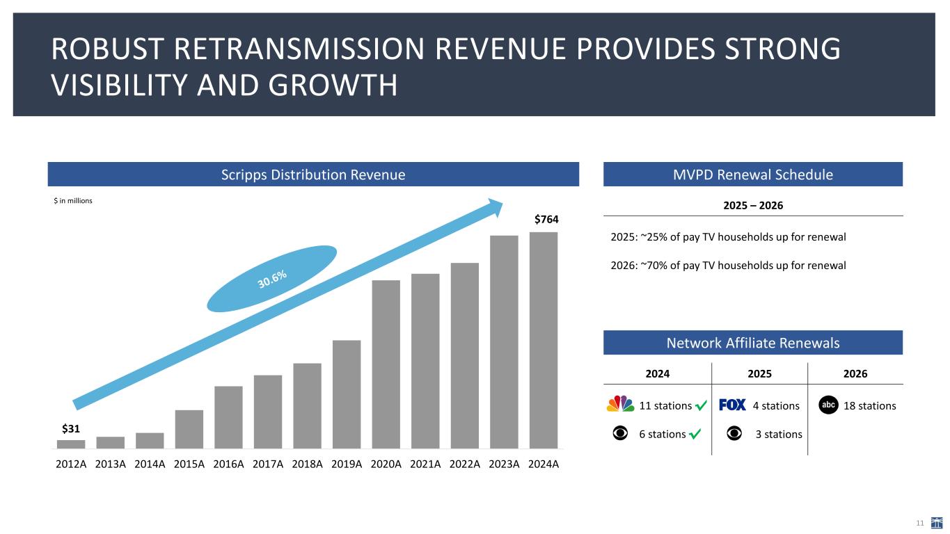 OUR POLITICAL ADVERTISING REVENUE REACHED ANOTHER RECORD LEVEL IN 2024 10 $101 $140 $267 $199 $343 2016A 2018A 2020A 2022A 2024A $ in millions INDUSTRY • Heightened polarization continues to drive political advertising spend • Broadcast TV continues to capture the lion’s share (AdImpact) • Key ballot issues have driven higher spend in purple states • Overall spend expected to continue to increase after record 2024 SCRIPPS • 2024 political revenue was $343 million, +28% vs. prior record (2020) • Growth in political revenue driven by: – Presidential race – Competitive U.S. Senate races, especially Montana, Nevada, Ohio and Arizona – Coverage in several states with key issues on November ballots Scripps Political Revenue (Local Media)