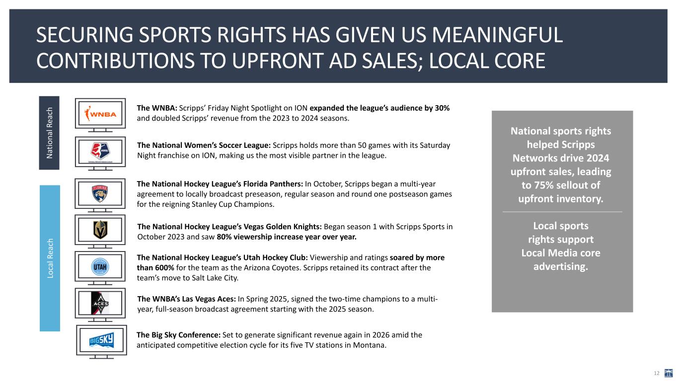 $31 $764 2012A 2013A 2014A 2015A 2016A 2017A 2018A 2019A 2020A 2021A 2022A 2023A 2024A ROBUST RETRANSMISSION REVENUE PROVIDES STRONG VISIBILITY AND GROWTH 11 Scripps Distribution Revenue Network Affiliate Renewals $ in millions MVPD Renewal Schedule 2025 – 2026 2025: ~25% of pay TV households up for renewal 2026: ~70% of pay TV households up for renewal 2024 2025 2026 11 stations √ 6 stations √ 4 stations 3 stations 18 stations