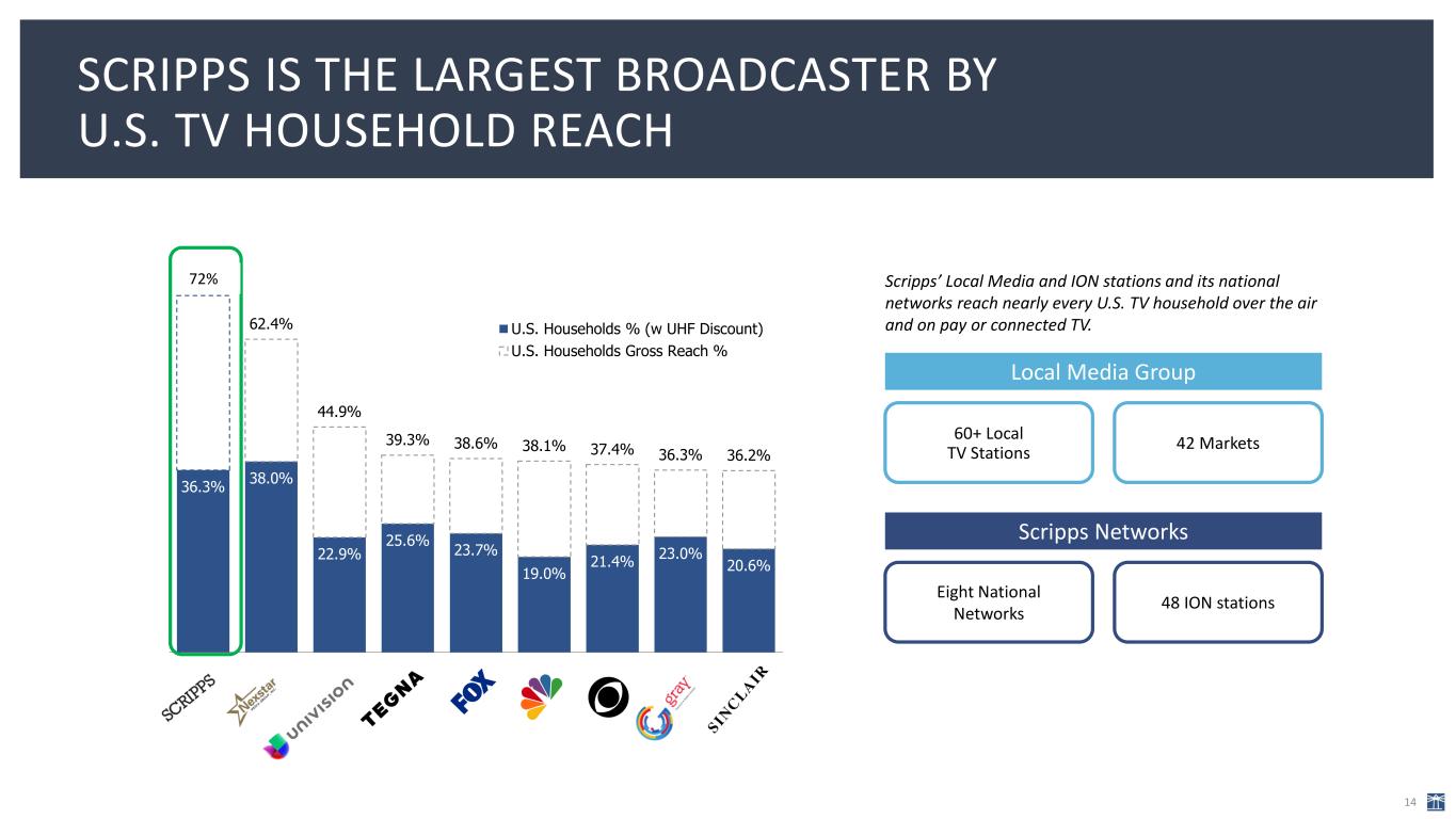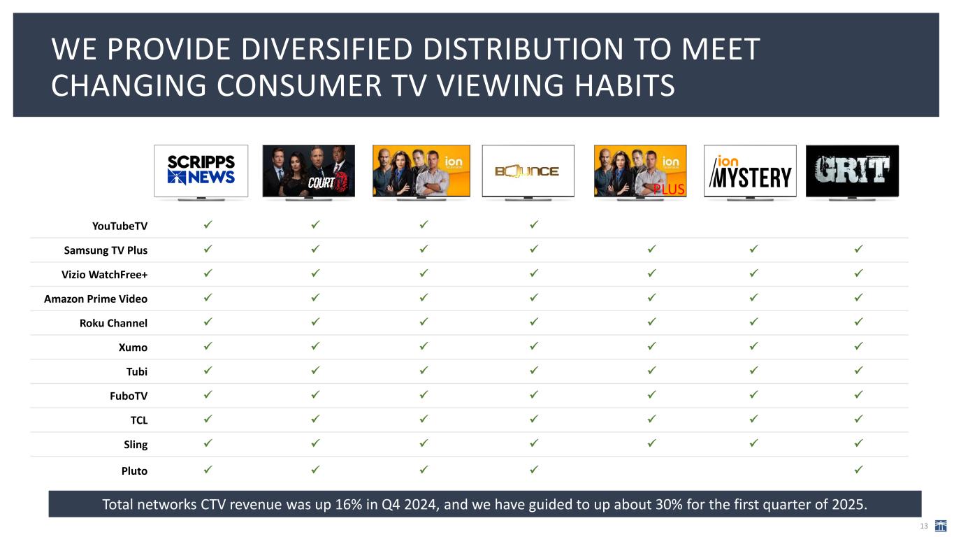 SECURING SPORTS RIGHTS HAS GIVEN US MEANINGFUL CONTRIBUTIONS TO UPFRONT AD SALES; LOCAL CORE 12 N at io na l R ea ch Lo ca l R ea ch The WNBA: Scripps’ Friday Night Spotlight on ION expanded the league’s audience by 30% and doubled Scripps’ revenue from the 2023 to 2024 seasons. The National Women’s Soccer League: Scripps holds more than 50 games with its Saturday Night franchise on ION, making us the most visible partner in the league. The National Hockey League’s Vegas Golden Knights: Began season 1 with Scripps Sports in October 2023 and saw 80% viewership increase year over year. The Big Sky Conference: Set to generate significant revenue again in 2026 amid the anticipated competitive election cycle for its five TV stations in Montana. The National Hockey League’s Utah Hockey Club: Viewership and ratings soared by more than 600% for the team as the Arizona Coyotes. Scripps retained its contract after the team’s move to Salt Lake City. The National Hockey League’s Florida Panthers: In October, Scripps began a multi-year agreement to locally broadcast preseason, regular season and round one postseason games for the reigning Stanley Cup Champions. National sports rights helped Scripps Networks drive 2024 upfront sales, leading to 75% sellout of upfront inventory. Local sports rights support Local Media core advertising. The WNBA’s Las Vegas Aces: In Spring 2025, signed the two-time champions to a multi- year, full-season broadcast agreement starting with the 2025 season.