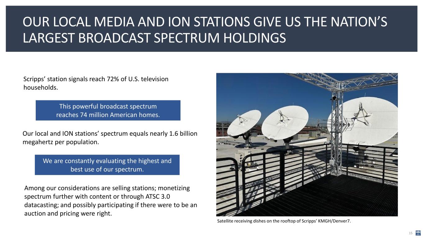 SCRIPPS IS THE LARGEST BROADCASTER BY U.S. TV HOUSEHOLD REACH 14 36.3% 38.0% 22.9% 25.6% 23.7% 19.0% 21.4% 23.0% 20.6% 71.1% 62.4% 44.9% 39.3% 38.6% 38.1% 37.4% 36.3% 36.2% U.S. Households % (w UHF Discount) U.S. Households Gross Reach % Local Media Group Scripps Networks 60+ Local TV Stations 42 Markets Eight National Networks 48 ION stations Scripps’ Local Media and ION stations and its national networks reach nearly every U.S. TV household over the air and on pay or connected TV. 72%