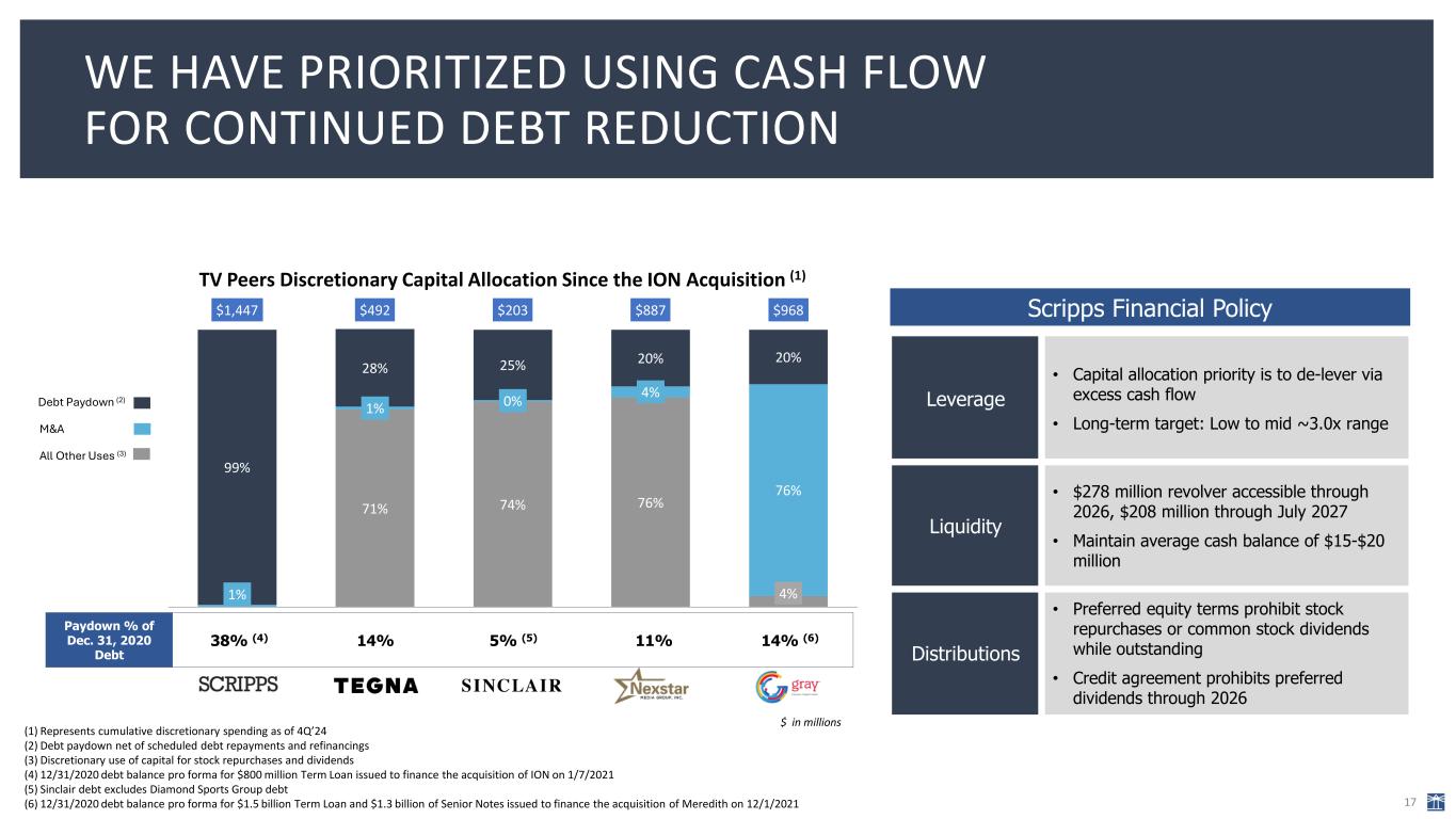 17 WE HAVE PRIORITIZED USING CASH FLOW FOR CONTINUED DEBT REDUCTION Paydown % of Dec. 31, 2020 Debt 38% (4) 14% 5% (5) 11% 14% (6) (1) Represents cumulative discretionary spending as of 4Q’24 (2) Debt paydown net of scheduled debt repayments and refinancings (3) Discretionary use of capital for stock repurchases and dividends (4) 12/31/2020 debt balance pro forma for $800 million Term Loan issued to finance the acquisition of ION on 1/7/2021 (5) Sinclair debt excludes Diamond Sports Group debt (6) 12/31/2020 debt balance pro forma for $1.5 billion Term Loan and $1.3 billion of Senior Notes issued to finance the acquisition of Meredith on 12/1/2021 Debt Paydown (2) M&A All Other Uses (3) TV Peers Discretionary Capital Allocation Since the ION Acquisition (1) 71% 74% 76% 4%1% 1% 0% 4% 76% 99% 28% 25% 20% 20% $1,447 $492 $203 $887 $968 Scripps Tegna Sinclair Ne xstar Gray $ in millions Scripps Financial Policy Leverage • Capital allocation priority is to de-lever via excess cash flow • Long-term target: Low to mid ~3.0x range Liquidity • $278 million revolver accessible through 2026, $208 million through July 2027 • Maintain average cash balance of $15-$20 million Distributions • Preferred equity terms prohibit stock repurchases or common stock dividends while outstanding • Credit agreement prohibits preferred dividends through 2026