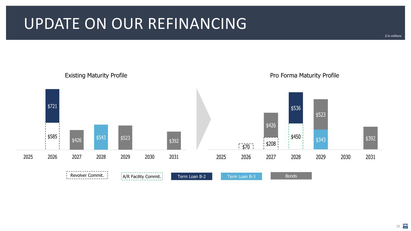 WE HAVE MADE SIGNIFICANT PROGRESS TOWARD LEVERAGE REDUCTION 18 $ in millions • Significant cash flow generation driven by strong political and continued optimization of expenses enabled Scripps to repay $330 million of debt. • Year-end leverage declined nearly a full turn from year-end 2023. • Specific steps taken include:  PIK of Berkshire Hathaway preferred (~$48 million/year)  Cost savings from reorganization program ($40 million/year)  Run-rate savings from reduction in Scripps News (~$35 million/year)  $70 million of real estate sales recently closed or under LOI Total Debt Commentary Net Leverage $2,987 $2,944 $2,940 $2,822 $2,643 Q4'23A Q1'24A Q2'24A Q3'24A Q4'24A 5.7x 5.8x 6.0x 5.1x 4.8x Q4'23A Q1'24A Q2'24A Q3'24A Q4'24A