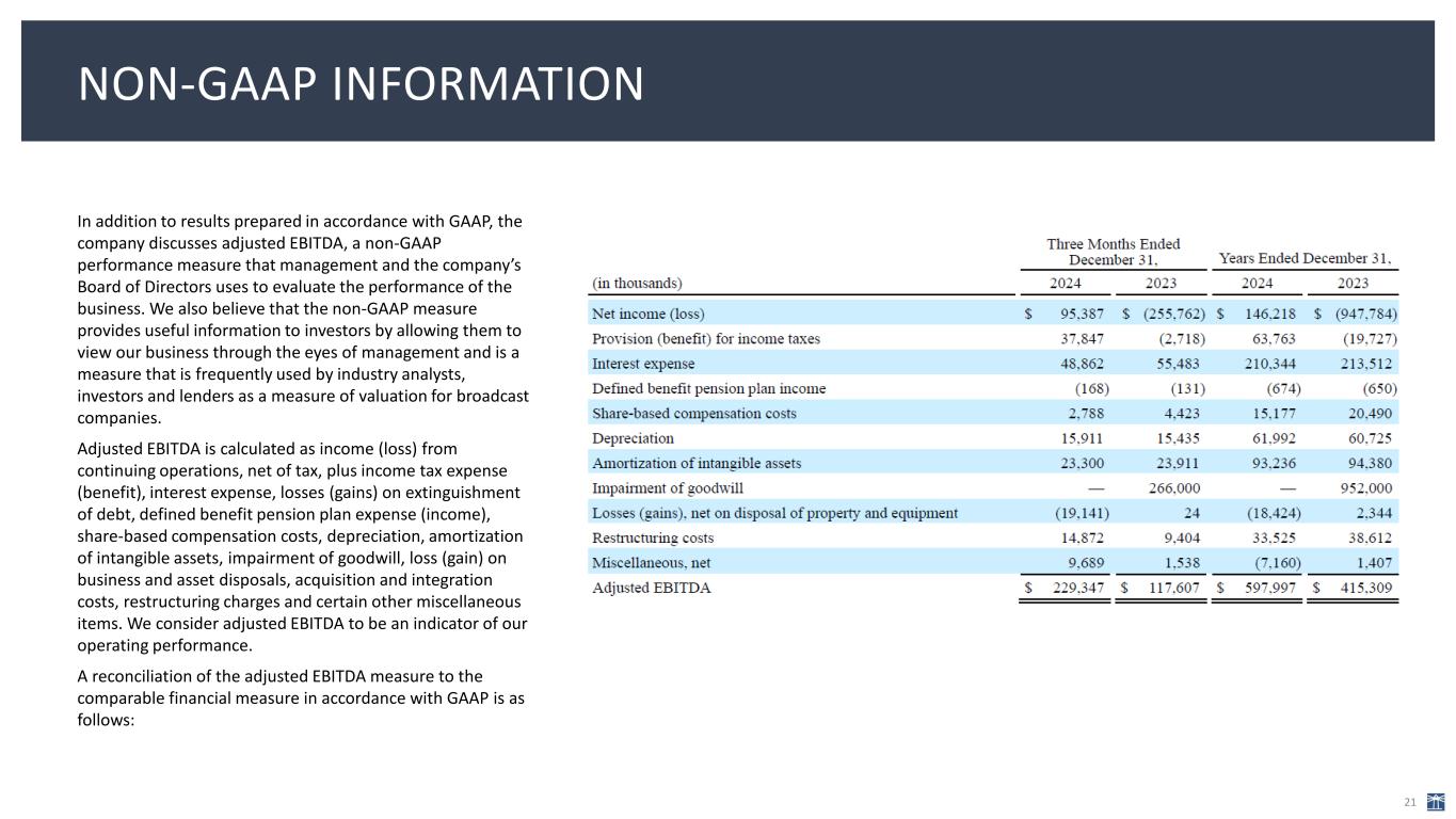 In addition to results prepared in accordance with GAAP, the company discusses adjusted EBITDA, a non-GAAP performance measure that management and the company’s Board of Directors uses to evaluate the performance of the business. We also believe that the non-GAAP measure provides useful information to investors by allowing them to view our business through the eyes of management and is a measure that is frequently used by industry analysts, investors and lenders as a measure of valuation for broadcast companies. Adjusted EBITDA is calculated as income (loss) from continuing operations, net of tax, plus income tax expense (benefit), interest expense, losses (gains) on extinguishment of debt, defined benefit pension plan expense (income), share-based compensation costs, depreciation, amortization of intangible assets, impairment of goodwill, loss (gain) on business and asset disposals, acquisition and integration costs, restructuring charges and certain other miscellaneous items. We consider adjusted EBITDA to be an indicator of our operating performance. A reconciliation of the adjusted EBITDA measure to the comparable financial measure in accordance with GAAP is as follows: 21 NON-GAAP INFORMATION