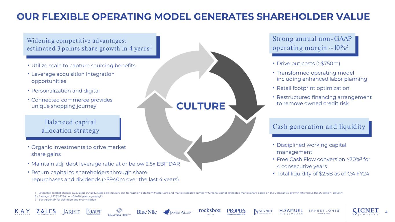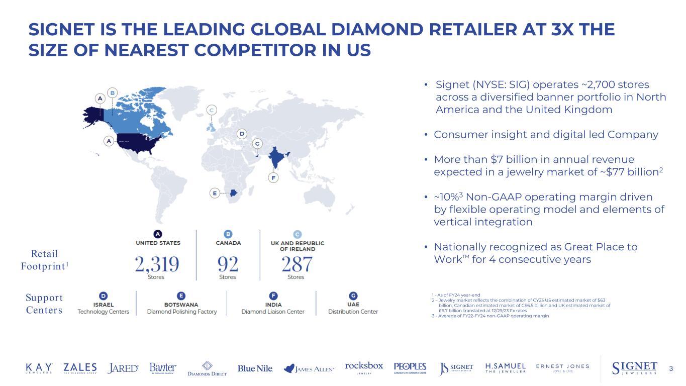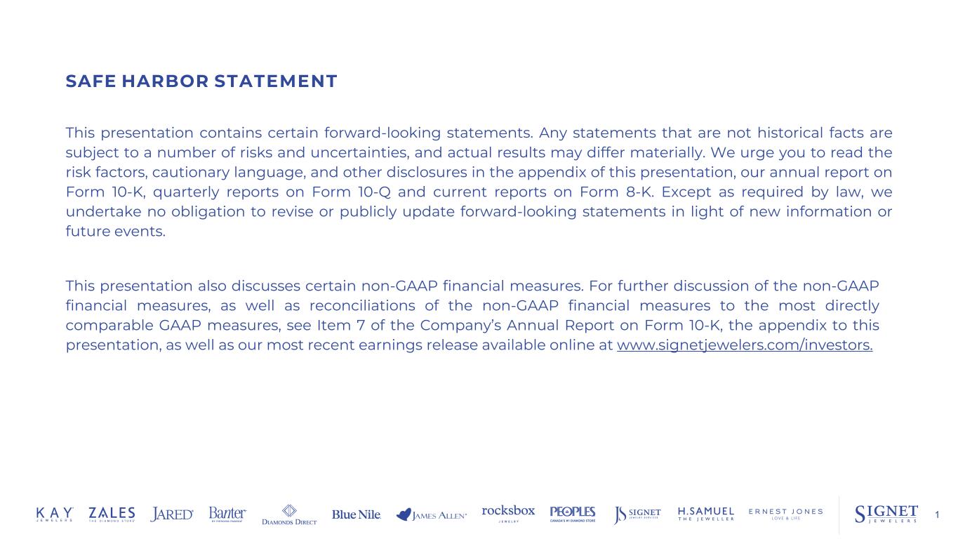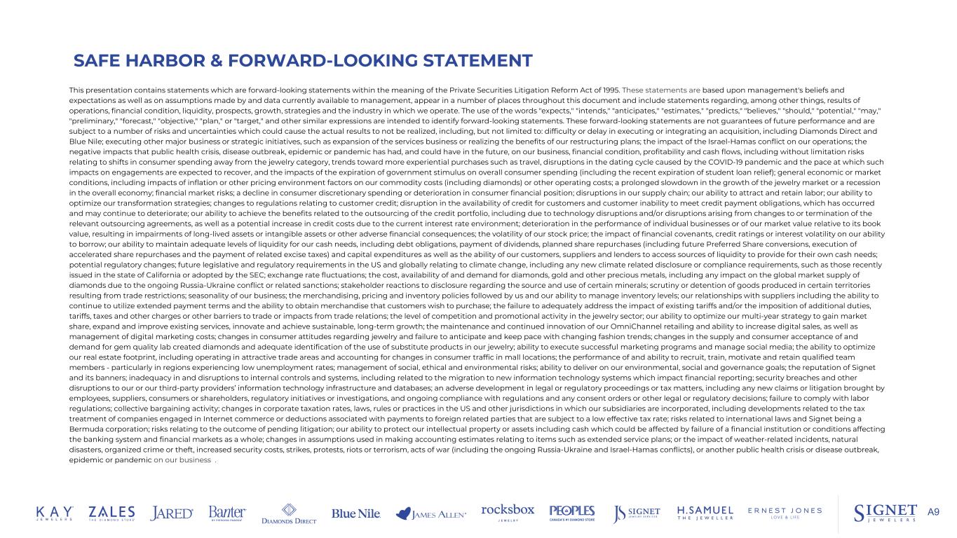 SAFE HARBOR & FORWARD-LOOKING STATEMENT This presentation contains statements which are forward-looking statements within the meaning of the Private Securities Litigation Reform Act of 1995. These statements are based upon management's beliefs and expectations as well as on assumptions made by and data currently available to management, appear in a number of places throughout this document and include statements regarding, among other things, results of operations, financial condition, liquidity, prospects, growth, strategies and the industry in which we operate. The use of the words "expects," "intends," "anticipates," "estimates," "predicts," "believes," "should," "potential," "may," "preliminary," "forecast," "objective," "plan," or "target," and other similar expressions are intended to identify forward-looking statements. These forward-looking statements are not guarantees of future performance and are subject to a number of risks and uncertainties which could cause the actual results to not be realized, including, but not limited to: difficulty or delay in executing or integrating an acquisition, including Diamonds Direct and Blue Nile; executing other major business or strategic initiatives, such as expansion of the services business or realizing the benefits of our restructuring plans; the impact of the Israel-Hamas conflict on our operations; the negative impacts that public health crisis, disease outbreak, epidemic or pandemic has had, and could have in the future, on our business, financial condition, profitability and cash flows, including without limitation risks relating to shifts in consumer spending away from the jewelry category, trends toward more experiential purchases such as travel, disruptions in the dating cycle caused by the COVID-19 pandemic and the pace at which such impacts on engagements are expected to recover, and the impacts of the expiration of government stimulus on overall consumer spending (including the recent expiration of student loan relief); general economic or market conditions, including impacts of inflation or other pricing environment factors on our commodity costs (including diamonds) or other operating costs; a prolonged slowdown in the growth of the jewelry market or a recession in the overall economy; financial market risks; a decline in consumer discretionary spending or deterioration in consumer financial position; disruptions in our supply chain; our ability to attract and retain labor; our ability to optimize our transformation strategies; changes to regulations relating to customer credit; disruption in the availability of credit for customers and customer inability to meet credit payment obligations, which has occurred and may continue to deteriorate; our ability to achieve the benefits related to the outsourcing of the credit portfolio, including due to technology disruptions and/or disruptions arising from changes to or termination of the relevant outsourcing agreements, as well as a potential increase in credit costs due to the current interest rate environment; deterioration in the performance of individual businesses or of our market value relative to its book value, resulting in impairments of long-lived assets or intangible assets or other adverse financial consequences; the volatility of our stock price; the impact of financial covenants, credit ratings or interest volatility on our ability to borrow; our ability to maintain adequate levels of liquidity for our cash needs, including debt obligations, payment of dividends, planned share repurchases (including future Preferred Share conversions, execution of accelerated share repurchases and the payment of related excise taxes) and capital expenditures as well as the ability of our customers, suppliers and lenders to access sources of liquidity to provide for their own cash needs; potential regulatory changes; future legislative and regulatory requirements in the US and globally relating to climate change, including any new climate related disclosure or compliance requirements, such as those recently issued in the state of California or adopted by the SEC; exchange rate fluctuations; the cost, availability of and demand for diamonds, gold and other precious metals, including any impact on the global market supply of diamonds due to the ongoing Russia-Ukraine conflict or related sanctions; stakeholder reactions to disclosure regarding the source and use of certain minerals; scrutiny or detention of goods produced in certain territories resulting from trade restrictions; seasonality of our business; the merchandising, pricing and inventory policies followed by us and our ability to manage inventory levels; our relationships with suppliers including the ability to continue to utilize extended payment terms and the ability to obtain merchandise that customers wish to purchase; the failure to adequately address the impact of existing tariffs and/or the imposition of additional duties, tariffs, taxes and other charges or other barriers to trade or impacts from trade relations; the level of competition and promotional activity in the jewelry sector; our ability to optimize our multi-year strategy to gain market share, expand and improve existing services, innovate and achieve sustainable, long-term growth; the maintenance and continued innovation of our OmniChannel retailing and ability to increase digital sales, as well as management of digital marketing costs; changes in consumer attitudes regarding jewelry and failure to anticipate and keep pace with changing fashion trends; changes in the supply and consumer acceptance of and demand for gem quality lab created diamonds and adequate identification of the use of substitute products in our jewelry; ability to execute successful marketing programs and manage social media; the ability to optimize our real estate footprint, including operating in attractive trade areas and accounting for changes in consumer traffic in mall locations; the