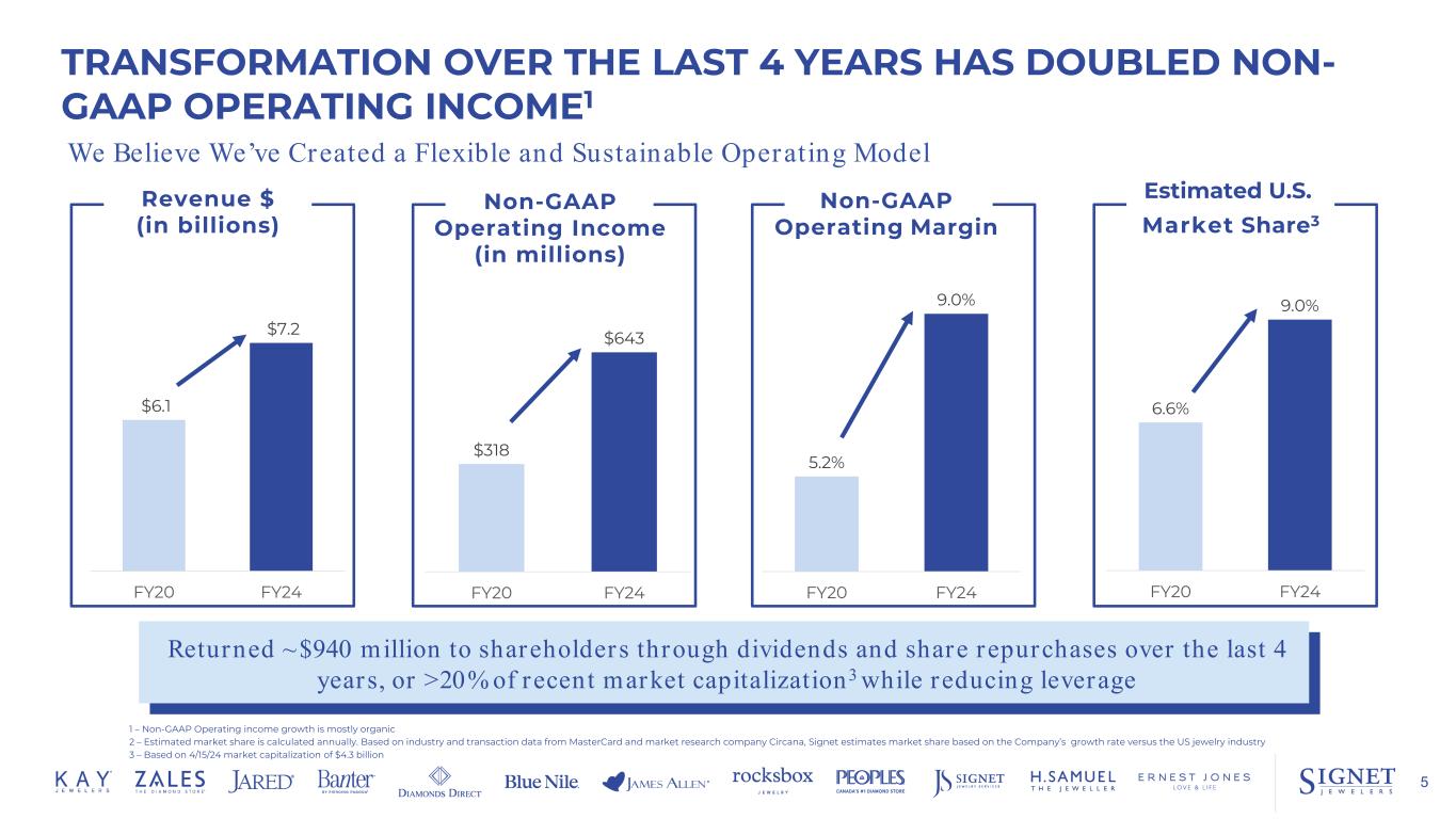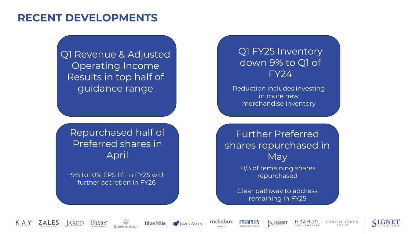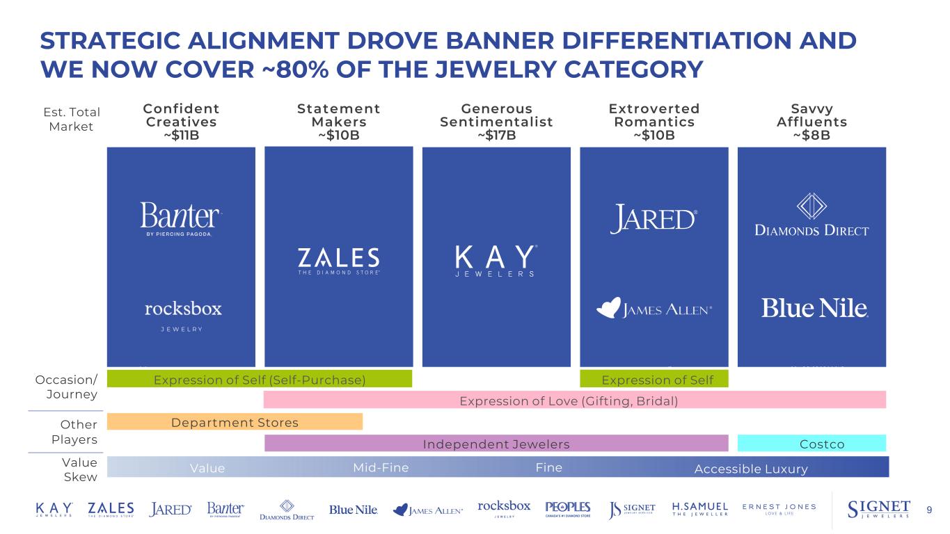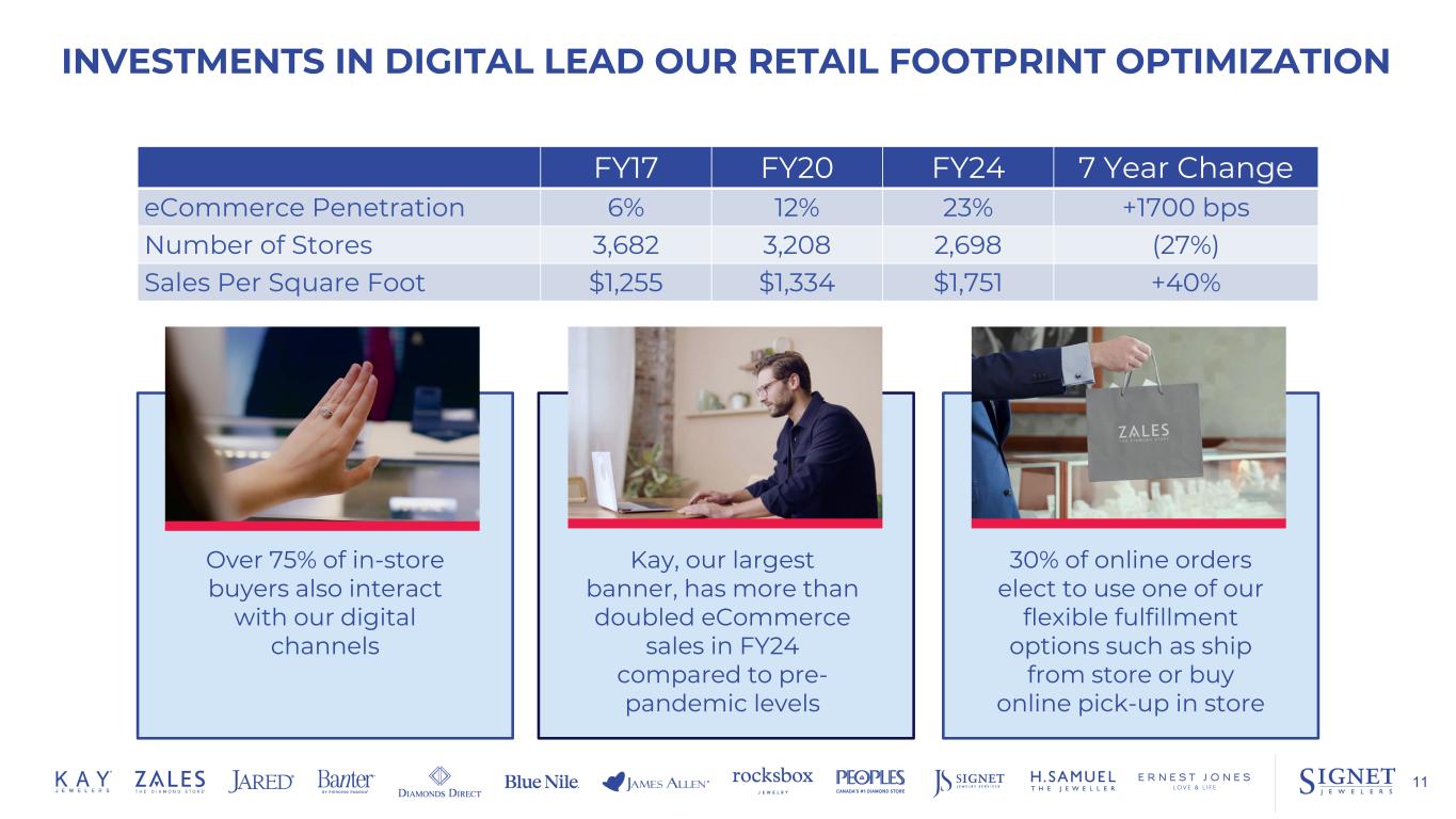 SAFE HARBOR & FORWARD-LOOKING STATEMENT This presentation contains statements which are forward-looking statements within the meaning of the Private Securities Litigation Reform Act of 1995. These statements are based upon management's beliefs and expectations as well as on assumptions made by and data currently available to management, appear in a number of places throughout this document and include statements regarding, among other things, results of operations, financial condition, liquidity, prospects, growth, strategies and the industry in which we operate. The use of the words "expects," "intends," "anticipates," "estimates," "predicts," "believes," "should," "potential," "may," "preliminary," "forecast," "objective," "plan," or "target," and other similar expressions are intended to identify forward-looking statements. These forward-looking statements are not guarantees of future performance and are subject to a number of risks and uncertainties which could cause the actual results to not be realized, including, but not limited to: difficulty or delay in executing or integrating an acquisition, including Diamonds Direct and Blue Nile; executing other major business or strategic initiatives, such as expansion of the services business or realizing the benefits of our restructuring plans; the impact of the Israel-Hamas conflict on our operations; the negative impacts that public health crisis, disease outbreak, epidemic or pandemic has had, and could have in the future, on our business, financial condition, profitability and cash flows, including without limitation risks relating to shifts in consumer spending away from the jewelry category, trends toward more experiential purchases such as travel, disruptions in the dating cycle caused by the COVID-19 pandemic and the pace at which such impacts on engagements are expected to recover, and the impacts of the expiration of government stimulus on overall consumer spending (including the recent expiration of student loan relief); general economic or market conditions, including impacts of inflation or other pricing environment factors on our commodity costs (including diamonds) or other operating costs; a prolonged slowdown in the growth of the jewelry market or a recession in the overall economy; financial market risks; a decline in consumer discretionary spending or deterioration in consumer financial position; disruptions in our supply chain; our ability to attract and retain labor; our ability to optimize our transformation strategies; changes to regulations relating to customer credit; disruption in the availability of credit for customers and customer inability to meet credit payment obligations, which has occurred and may continue to deteriorate; our ability to achieve the benefits related to the outsourcing of the credit portfolio, including due to technology disruptions and/or disruptions arising from changes to or termination of the relevant outsourcing agreements, as well as a potential increase in credit costs due to the current interest rate environment; deterioration in the performance of individual businesses or of our market value relative to its book value, resulting in impairments of long-lived assets or intangible assets or other adverse financial consequences; the volatility of our stock price; the impact of financial covenants, credit ratings or interest volatility on our ability to borrow; our ability to maintain adequate levels of liquidity for our cash needs, including debt obligations, payment of dividends, planned share repurchases (including future Preferred Share conversions, execution of accelerated share repurchases and the payment of related excise taxes) and capital expenditures as well as the ability of our customers, suppliers and lenders to access sources of liquidity to provide for their own cash needs; potential regulatory changes; future legislative and regulatory requirements in the US and globally relating to climate change, including any new climate related disclosure or compliance requirements, such as those recently issued in the state of California or adopted by the SEC; exchange rate fluctuations; the cost, availability of and demand for diamonds, gold and other precious metals, including any impact on the global market supply of diamonds due to the ongoing Russia-Ukraine conflict or related sanctions; stakeholder reactions to disclosure regarding the source and use of certain minerals; scrutiny or detention of goods produced in certain territories resulting from trade restrictions; seasonality of our business; the merchandising, pricing and inventory policies followed by us and our ability to manage inventory levels; our relationships with suppliers including the ability to continue to utilize extended payment terms and the ability to obtain merchandise that customers wish to purchase; the failure to adequately address the impact of existing tariffs and/or the imposition of additional duties, tariffs, taxes and other charges or other barriers to trade or impacts from trade relations; the level of competition and promotional activity in the jewelry sector; our ability to optimize our multi-year strategy to gain market share, expand and improve existing services, innovate and achieve sustainable, long-term growth; the maintenance and continued innovation of our OmniChannel retailing and ability to increase digital sales, as well as management of digital marketing costs; changes in consumer attitudes regarding jewelry and failure to anticipate and keep pace with changing fashion trends; changes in the supply and consumer acceptance of and demand for gem quality lab created diamonds and adequate identification of the use of substitute products in our jewelry; ability to execute successful marketing programs and manage social media; the ability to optimize our real estate footprint, including operating in attractive trade areas and accounting for changes in consumer traffic in mall locations; the