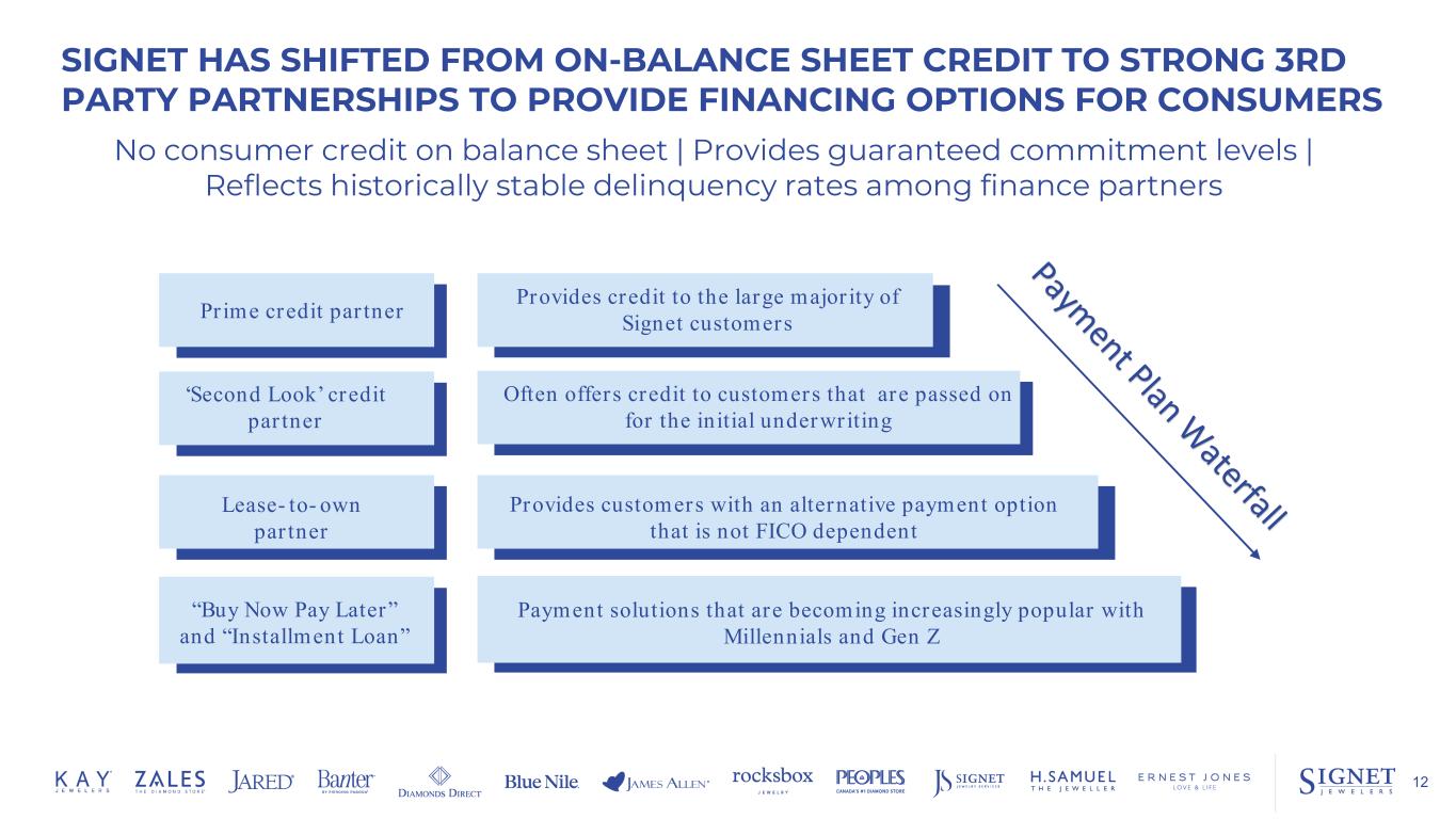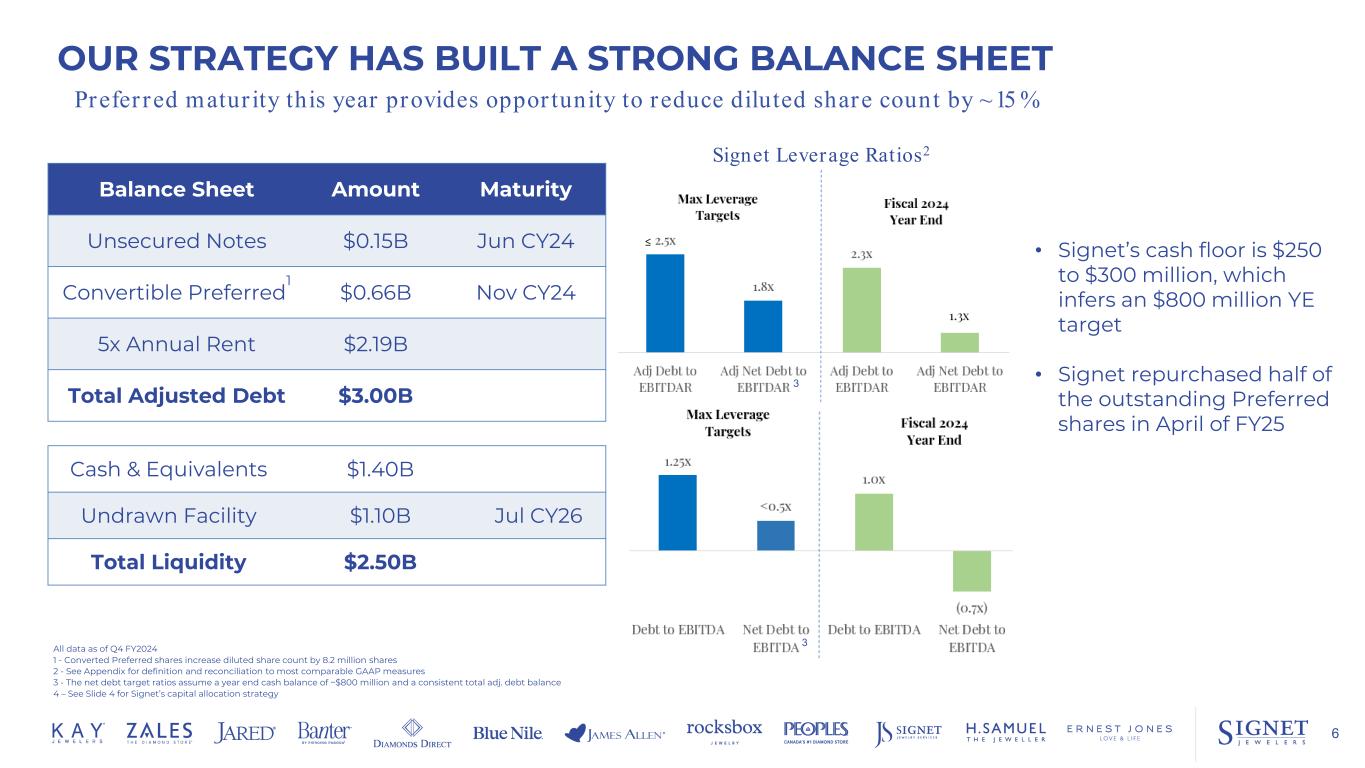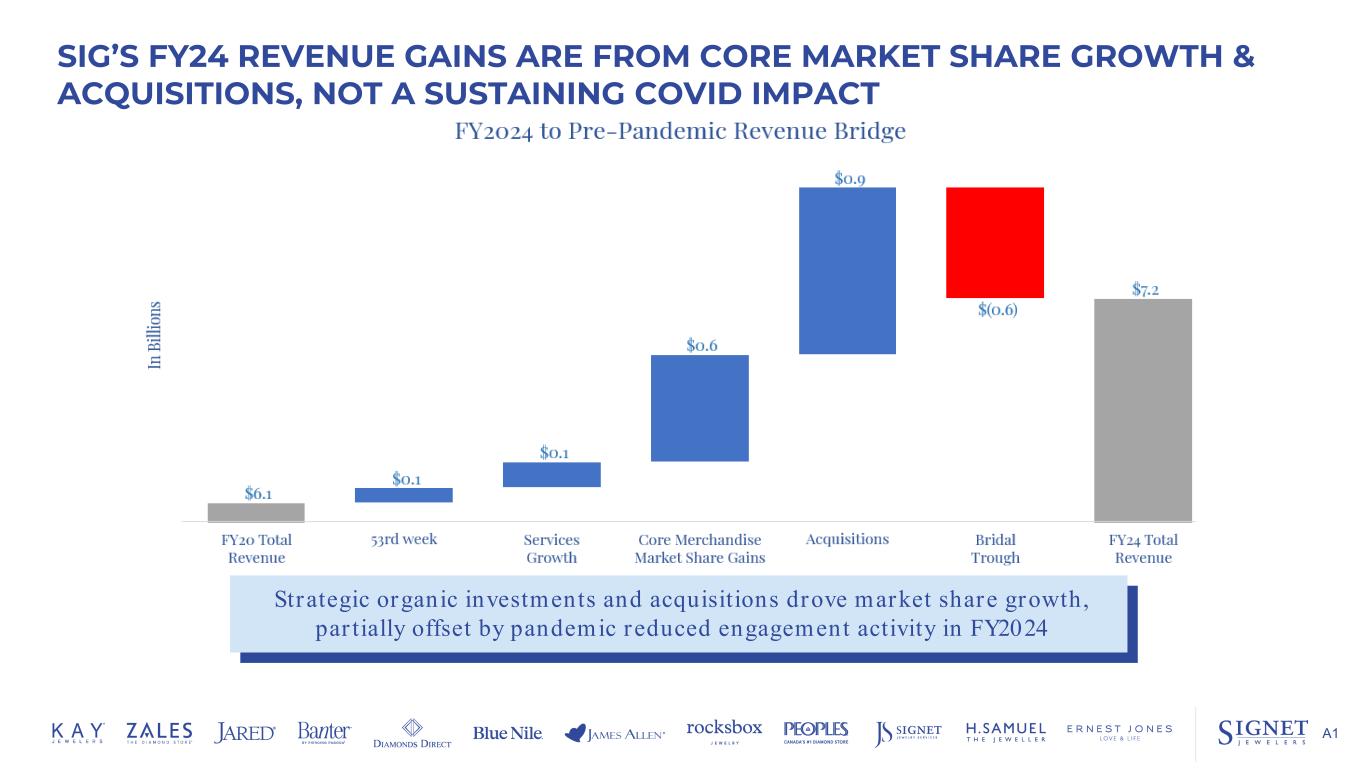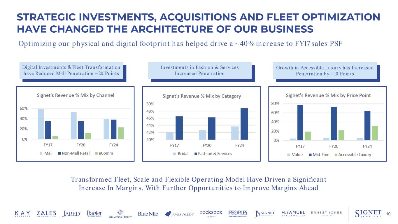 SAFE HARBOR & FORWARD-LOOKING STATEMENT This presentation contains statements which are forward-looking statements within the meaning of the Private Securities Litigation Reform Act of 1995. These statements are based upon management's beliefs and expectations as well as on assumptions made by and data currently available to management, appear in a number of places throughout this document and include statements regarding, among other things, results of operations, financial condition, liquidity, prospects, growth, strategies and the industry in which we operate. The use of the words "expects," "intends," "anticipates," "estimates," "predicts," "believes," "should," "potential," "may," "preliminary," "forecast," "objective," "plan," or "target," and other similar expressions are intended to identify forward-looking statements. These forward-looking statements are not guarantees of future performance and are subject to a number of risks and uncertainties which could cause the actual results to not be realized, including, but not limited to: difficulty or delay in executing or integrating an acquisition, including Diamonds Direct and Blue Nile; executing other major business or strategic initiatives, such as expansion of the services business or realizing the benefits of our restructuring plans; the impact of the Israel-Hamas conflict on our operations; the negative impacts that public health crisis, disease outbreak, epidemic or pandemic has had, and could have in the future, on our business, financial condition, profitability and cash flows, including without limitation risks relating to shifts in consumer spending away from the jewelry category, trends toward more experiential purchases such as travel, disruptions in the dating cycle caused by the COVID-19 pandemic and the pace at which such impacts on engagements are expected to recover, and the impacts of the expiration of government stimulus on overall consumer spending (including the recent expiration of student loan relief); general economic or market conditions, including impacts of inflation or other pricing environment factors on our commodity costs (including diamonds) or other operating costs; a prolonged slowdown in the growth of the jewelry market or a recession in the overall economy; financial market risks; a decline in consumer discretionary spending or deterioration in consumer financial position; disruptions in our supply chain; our ability to attract and retain labor; our ability to optimize our transformation strategies; changes to regulations relating to customer credit; disruption in the availability of credit for customers and customer inability to meet credit payment obligations, which has occurred and may continue to deteriorate; our ability to achieve the benefits related to the outsourcing of the credit portfolio, including due to technology disruptions and/or disruptions arising from changes to or termination of the relevant outsourcing agreements, as well as a potential increase in credit costs due to the current interest rate environment; deterioration in the performance of individual businesses or of our market value relative to its book value, resulting in impairments of long-lived assets or intangible assets or other adverse financial consequences; the volatility of our stock price; the impact of financial covenants, credit ratings or interest volatility on our ability to borrow; our ability to maintain adequate levels of liquidity for our cash needs, including debt obligations, payment of dividends, planned share repurchases (including future Preferred Share conversions, execution of accelerated share repurchases and the payment of related excise taxes) and capital expenditures as well as the ability of our customers, suppliers and lenders to access sources of liquidity to provide for their own cash needs; potential regulatory changes; future legislative and regulatory requirements in the US and globally relating to climate change, including any new climate related disclosure or compliance requirements, such as those recently issued in the state of California or adopted by the SEC; exchange rate fluctuations; the cost, availability of and demand for diamonds, gold and other precious metals, including any impact on the global market supply of diamonds due to the ongoing Russia-Ukraine conflict or related sanctions; stakeholder reactions to disclosure regarding the source and use of certain minerals; scrutiny or detention of goods produced in certain territories resulting from trade restrictions; seasonality of our business; the merchandising, pricing and inventory policies followed by us and our ability to manage inventory levels; our relationships with suppliers including the ability to continue to utilize extended payment terms and the ability to obtain merchandise that customers wish to purchase; the failure to adequately address the impact of existing tariffs and/or the imposition of additional duties, tariffs, taxes and other charges or other barriers to trade or impacts from trade relations; the level of competition and promotional activity in the jewelry sector; our ability to optimize our multi-year strategy to gain market share, expand and improve existing services, innovate and achieve sustainable, long-term growth; the maintenance and continued innovation of our OmniChannel retailing and ability to increase digital sales, as well as management of digital marketing costs; changes in consumer attitudes regarding jewelry and failure to anticipate and keep pace with changing fashion trends; changes in the supply and consumer acceptance of and demand for gem quality lab created diamonds and adequate identification of the use of substitute products in our jewelry; ability to execute successful marketing programs and manage social media; the ability to optimize our real estate footprint, including operating in attractive trade areas and accounting for changes in consumer traffic in mall locations; the