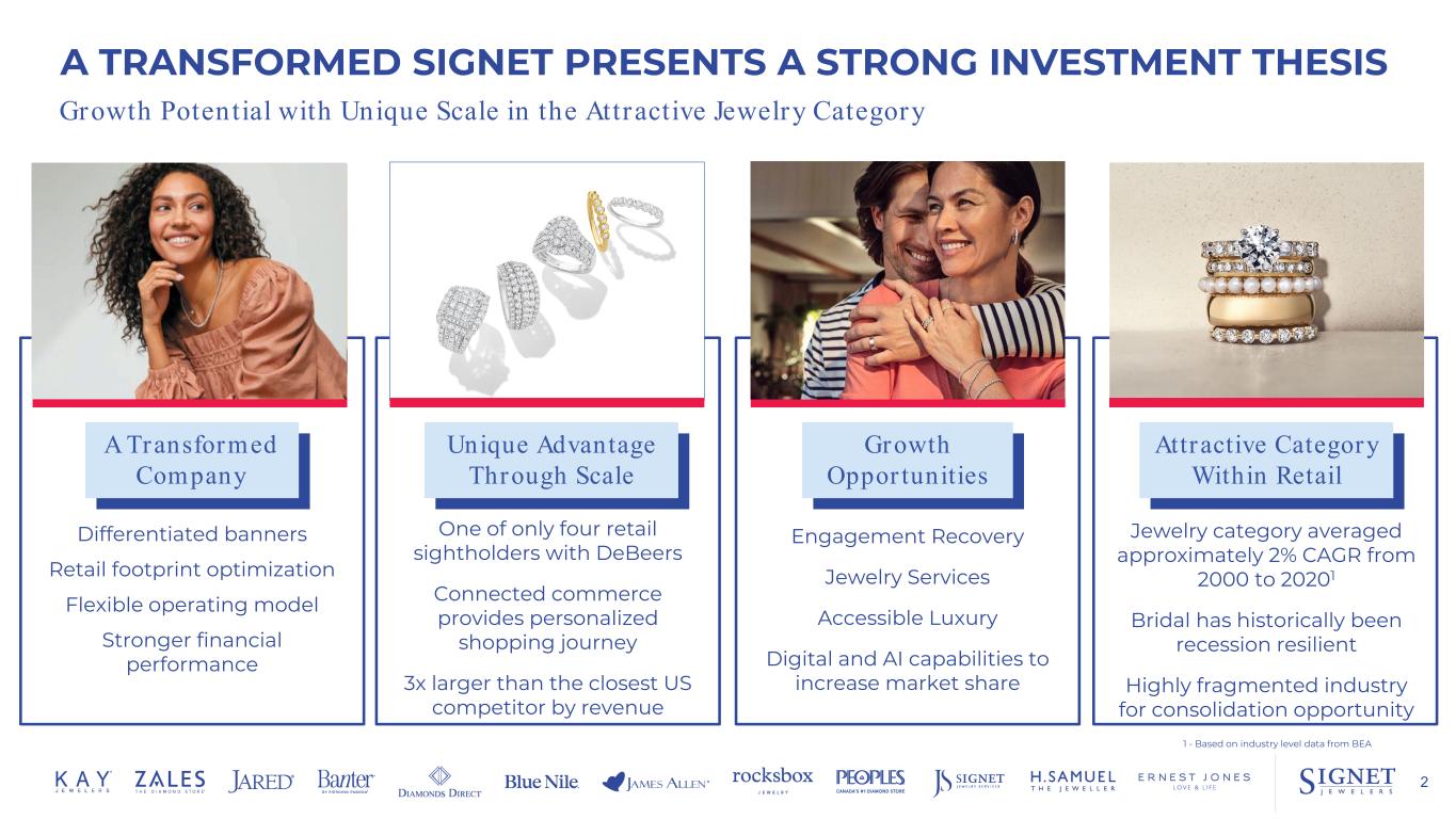 SAFE HARBOR STATEMENT This presentation contains certain forward-looking statements. Any statements that are not historical facts are subject to a number of risks and uncertainties, and actual results may differ materially. We urge you to read the risk factors, cautionary language, and other disclosures in the appendix of this presentation, our annual report on Form 10-K, quarterly reports on Form 10-Q and current reports on Form 8-K. Except as required by law, we undertake no obligation to revise or publicly update forward-looking statements in light of new information or future events. This presentation also discusses certain non-GAAP financial measures. For further discussion of the non-GAAP financial measures, as well as reconciliations of the non-GAAP financial measures to the most directly comparable GAAP measures, see Item 7 of the Company’s Annual Report on Form 10-K, the appendix to this presentation, as well as our most recent earnings release available online at www.signetjewelers.com/investors. 1