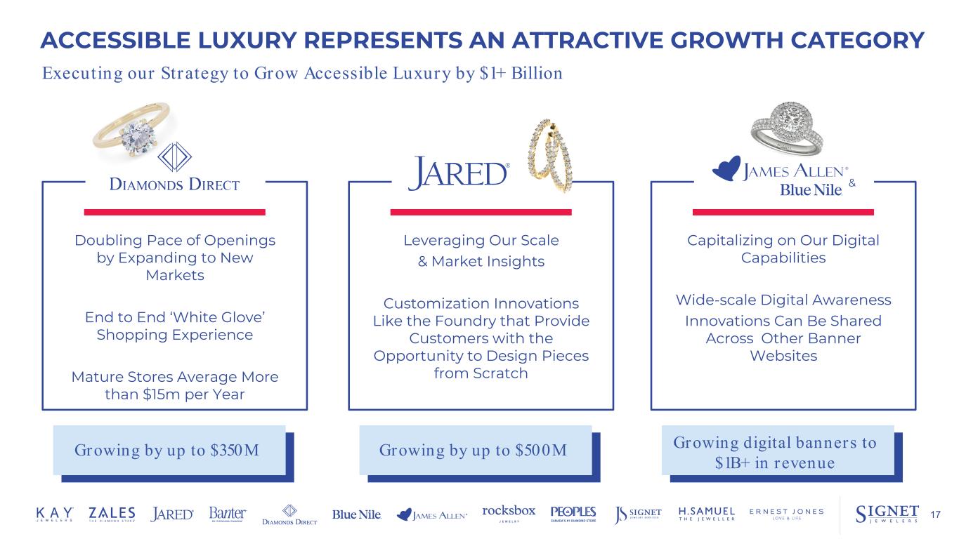 16 ENGAGEMENT RECOVERY UNDER WAY, WITH MORE THAN 25% GROWTH EXPECTED THROUGH 2026 Engagements: Derived from number of weddings and company estimates. Past internal primary research provides the historical relationship between engagements and weddings. Lisa W. Miller & Associates provided tracking data showing the impact of COVID on dating which impacts future engagements. Pre-Pandemic average includes CY2014-2020 Incidents of engagements troughed in the Fall of Fiscal 2024 and are expected to recover 5% to 10% in Fiscal 2025 Signet is well positioned to benefit from engagement recovery and gain market share Retail Jewelry Industry Signet Jewelers 2.6 2.82.8 2.8 2.5 2.15 2.3-2.4 ~20% Bridal ~50% Bridal Engagement recovery will be dr iven by multi- cultural couples, reflecting changing demographics