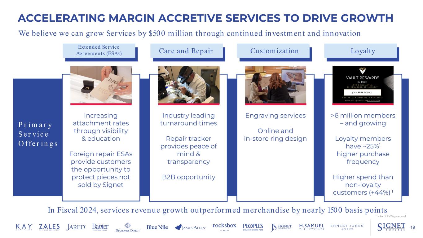 • Nearly all of Jared’s ATV increase over last 4 years has come from assortment changes and premiumization, with a low single digit impact from taking price • Jared positioned as an Accessible Luxury Banner, above Kay and Zales FY20 to FY24 +~40% +~60% Compared to N. America ATV >3x N. Amer ica ATV Jared ATV FY20 to FY24 Diamonds Direct ATV LEANING INTO ACCESSIBLE LUXURY IS IMPROVING AVERAGE TRANSACTION VALUE PRIMARILY BASED ON ASSORTMENT ARCHITECTURE Higher pr ice point items dr iven by premium quality metals, fancier cuts and larger carats 18
