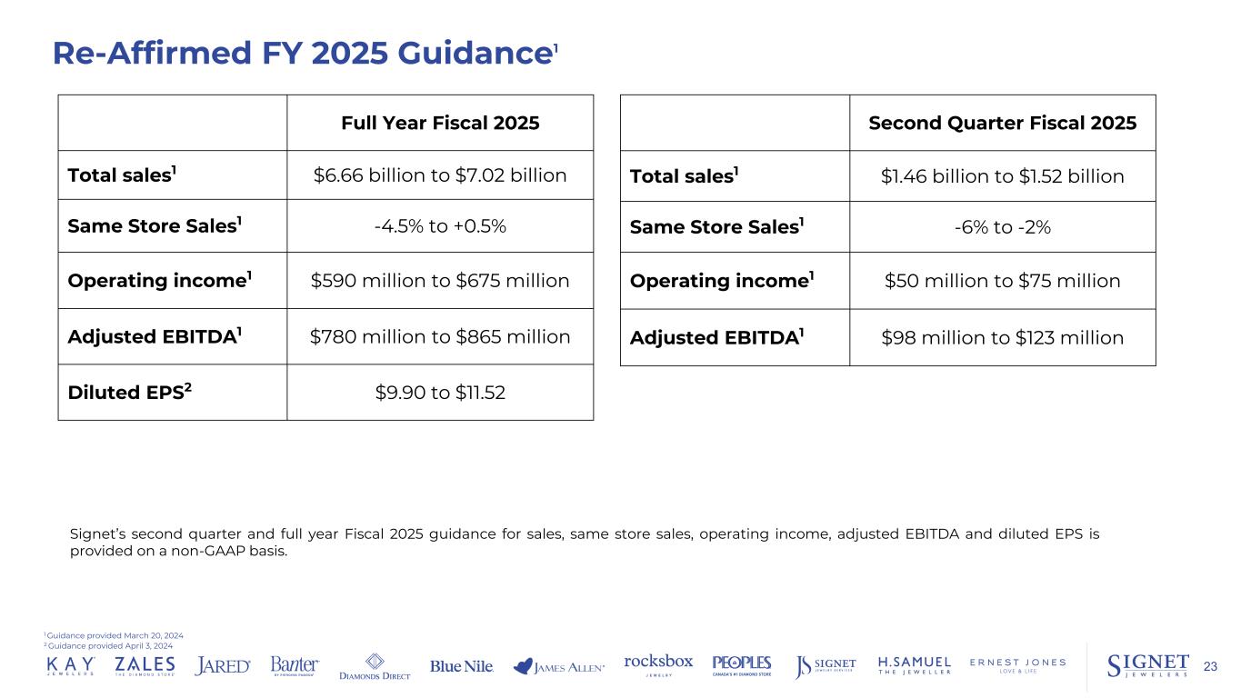 23 Re-Affirmed FY 2025 Guidance1 Second Quarter Fiscal 2025 Total sales1 $1.46 billion to $1.52 billion Same Store Sales1 -6% to -2% Operating income1 $50 million to $75 million Adjusted EBITDA1 $98 million to $123 million Full Year Fiscal 2025 Total sales1 $6.66 billion to $7.02 billion Same Store Sales1 -4.5% to +0.5% Operating income1 $590 million to $675 million Adjusted EBITDA1 $780 million to $865 million Diluted EPS2 $9.90 to $11.52 Signet’s second quarter and full year Fiscal 2025 guidance for sales, same store sales, operating income, adjusted EBITDA and diluted EPS is provided on a non-GAAP basis. 1 Guidance provided March 20, 2024 2 Guidance provided April 3, 2024