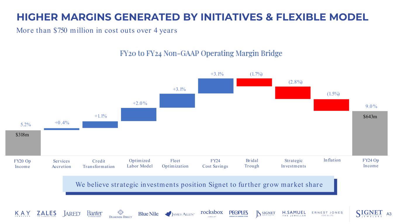 More than $750 million in cost outs over 4 years HIGHER MARGINS GENERATED BY INITIATIVES & FLEXIBLE MODEL A3 $318m $643m 5.2% +0 .4% +2.0 % +3.1% +3.1% (1.7%) (2.8%) (1.5%) 9.0 % +1.1% 1 We believe strategic investments position Signet to fur ther grow market share FY20 Op Income Services Accretion Credit Transformation Optimized Labor Model Fleet Optimization FY24 Cost Savings Br idal Trough Strategic Investments Inflation FY24 Op Income