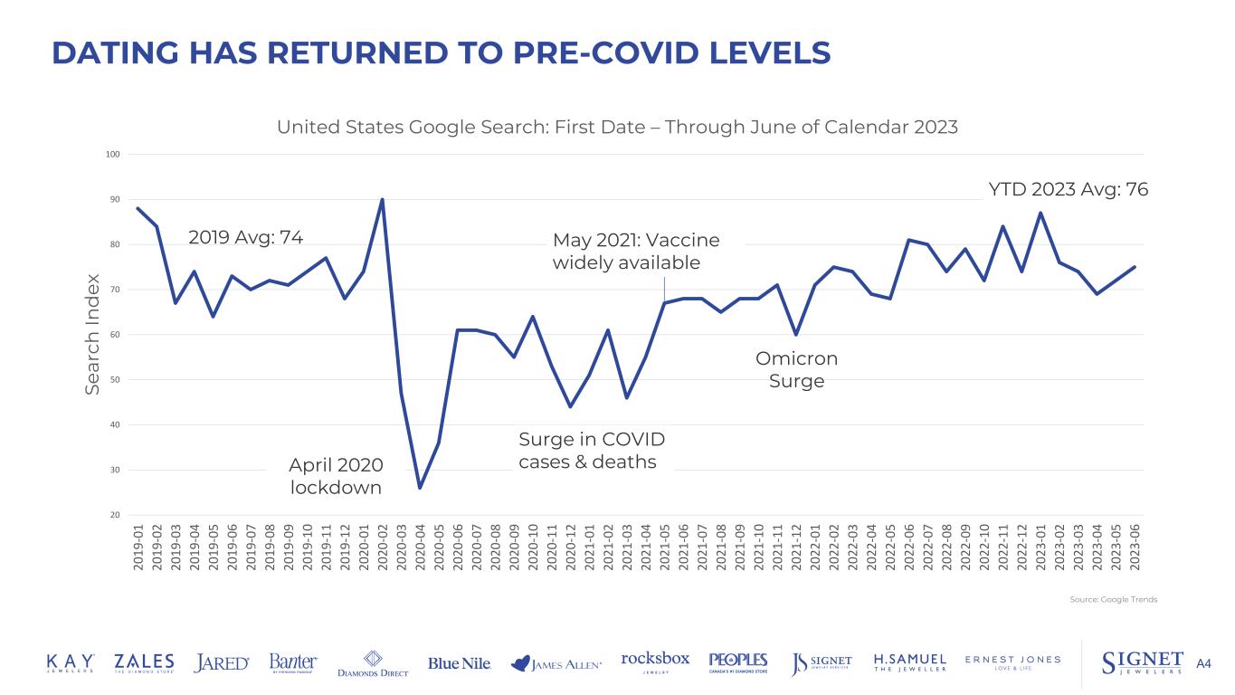 DATING HAS RETURNED TO PRE-COVID LEVELS 20 30 40 50 60 70 80 90 100 20 19 -0 1 20 19 -0 2 20 19 -0 3 20 19 -0 4 20 19 -0 5 20 19 -0 6 20 19 -0 7 20 19 -0 8 20 19 -0 9 20 19 -1 0 20 19 -1 1 20 19 -1 2 20 20 -0 1 20 20 -0 2 20 20 -0 3 20 20 -0 4 20 20 -0 5 20 20 -0 6 20 20 -0 7 20 20 -0 8 20 20 -0 9 20 20 -1 0 20 20 -1 1 20 20 -1 2 20 21 -0 1 20 21 -0 2 20 21 -0 3 20 21 -0 4 20 21 -0 5 20 21 -0 6 20 21 -0 7 20 21 -0 8 20 21 -0 9 20 21 -1 0 20 21 -1 1 20 21 -1 2 20 22 -0 1 20 22 -0 2 20 22 -0 3 20 22 -0 4 20 22 -0 5 20 22 -0 6 20 22 -0 7 20 22 -0 8 20 22 -0 9 20 22 -1 0 20 22 -1 1 20 22 -1 2 20 23 -0 1 20 23 -0 2 20 23 -0 3 20 23 -0 4 20 23 -0 5 20 23 -0 6 Se ar ch In d ex United States Google Search: First Date – Through June of Calendar 2023 April 2020 lockdown Omicron Surge Surge in COVID cases & deaths May 2021: Vaccine widely available 2019 Avg: 74 YTD 2023 Avg: 76 Source: Google Trends A4