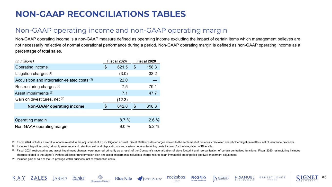 NON-GAAP RECONCILIATIONS TABLES Non-GAAP operating income and non-GAAP operating margin Non-GAAP operating income is a non-GAAP measure defined as operating income excluding the impact of certain items which management believes are not necessarily reflective of normal operational performance during a period. Non-GAAP operating margin is defined as non-GAAP operating income as a percentage of total sales. (in millions) Fiscal 2024 Fiscal 2020 Operating income $ 621.5 $ 158.3 Litigation charges (1) (3.0) 33.2 Acquisition and integration-related costs (2) 22.0 — Restructuring charges (3) 7.5 79.1 Asset impairments (3) 7.1 47.7 Gain on divestitures, net (4) (12.3) — Non-GAAP operating income $ 642.8 $ 318.3 Operating margin 8.7 % 2.6 % Non-GAAP operating margin 9.0 % 5.2 % (1) Fiscal 2024 includes a credit to income related to the adjustment of a prior litigation accrual. Fiscal 2020 includes charges related to the settlement of previously disclosed shareholder litigation matters, net of insurance proceeds. (2) Includes integration costs, primarily severance and retention, exit and disposal costs and system decommissioning costs incurred for the integration of Blue Nile. (3) Fiscal 2024 restructuring and asset impairment charges were incurred primarily as a result of the Company’s rationalization of store footprint and reorganization of certain centralized functions. Fiscal 2020 restructuring includes charges related to the Signet’s Path to Brilliance transformation plan and asset impairments includes a charge related to an immaterial out of period goodwill impairment adjustment. (4) Includes gain of sale of the UK prestige watch business, net of transaction costs. A5