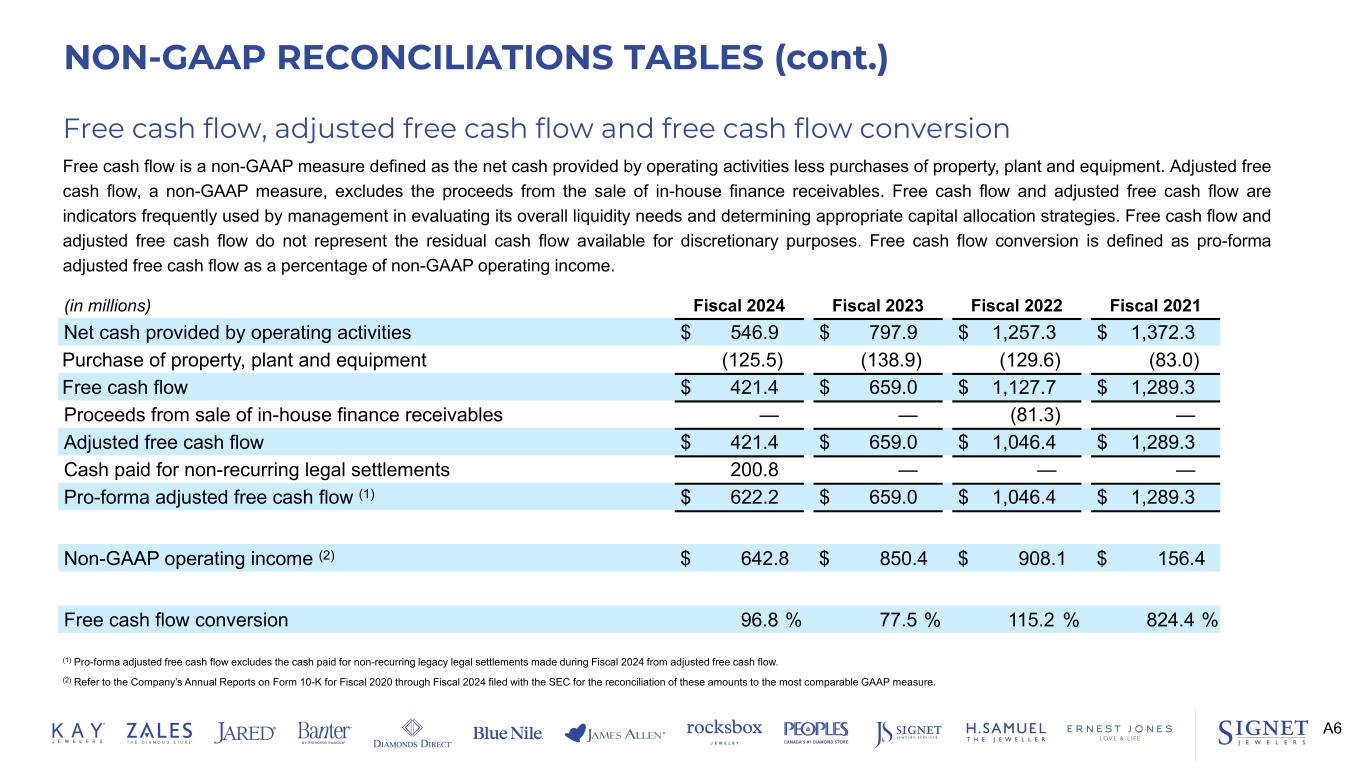 NON-GAAP RECONCILIATIONS TABLES (cont.) Free cash flow, adjusted free cash flow and free cash flow conversion Free cash flow is a non-GAAP measure defined as the net cash provided by operating activities less purchases of property, plant and equipment. Adjusted free cash flow, a non-GAAP measure, excludes the proceeds from the sale of in-house finance receivables. Free cash flow and adjusted free cash flow are indicators frequently used by management in evaluating its overall liquidity needs and determining appropriate capital allocation strategies. Free cash flow and adjusted free cash flow do not represent the residual cash flow available for discretionary purposes. Free cash flow conversion is defined as pro-forma adjusted free cash flow as a percentage of non-GAAP operating income. (in millions) Fiscal 2024 Fiscal 2023 Fiscal 2022 Fiscal 2021 Net cash provided by operating activities $ 546.9 $ 797.9 $ 1,257.3 $ 1,372.3 Purchase of property, plant and equipment (125.5) (138.9) (129.6) (83.0) Free cash flow $ 421.4 $ 659.0 $ 1,127.7 $ 1,289.3 Proceeds from sale of in-house finance receivables — — (81.3) — Adjusted free cash flow $ 421.4 $ 659.0 $ 1,046.4 $ 1,289.3 Cash paid for non-recurring legal settlements 200.8 — — — Pro-forma adjusted free cash flow (1) $ 622.2 $ 659.0 $ 1,046.4 $ 1,289.3 Non-GAAP operating income (2) $ 642.8 $ 850.4 $ 908.1 $ 156.4 Free cash flow conversion 96.8 % 77.5 % 115.2 % 824.4 % (1) Pro-forma adjusted free cash flow excludes the cash paid for non-recurring legacy legal settlements made during Fiscal 2024 from adjusted free cash flow. (2) Refer to the Company’s Annual Reports on Form 10-K for Fiscal 2020 through Fiscal 2024 filed with the SEC for the reconciliation of these amounts to the most comparable GAAP measure. A6