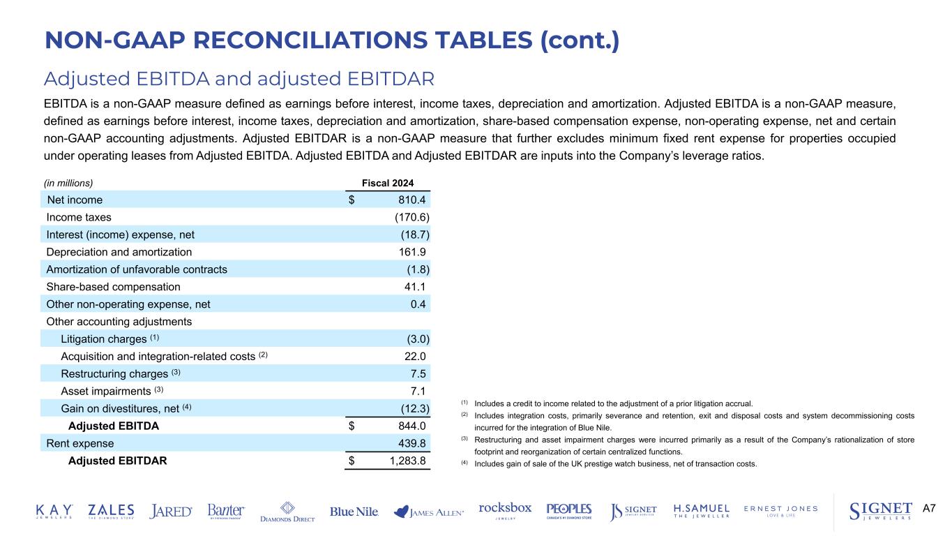 NON-GAAP RECONCILIATIONS TABLES (cont.) Adjusted EBITDA and adjusted EBITDAR EBITDA is a non-GAAP measure defined as earnings before interest, income taxes, depreciation and amortization. Adjusted EBITDA is a non-GAAP measure, defined as earnings before interest, income taxes, depreciation and amortization, share-based compensation expense, non-operating expense, net and certain non-GAAP accounting adjustments. Adjusted EBITDAR is a non-GAAP measure that further excludes minimum fixed rent expense for properties occupied under operating leases from Adjusted EBITDA. Adjusted EBITDA and Adjusted EBITDAR are inputs into the Company’s leverage ratios. (in millions) Fiscal 2024 Net income $ 810.4 Income taxes (170.6) Interest (income) expense, net (18.7) Depreciation and amortization 161.9 Amortization of unfavorable contracts (1.8) Share-based compensation 41.1 Other non-operating expense, net 0.4 Other accounting adjustments Litigation charges (1) (3.0) Acquisition and integration-related costs (2) 22.0 Restructuring charges (3) 7.5 Asset impairments (3) 7.1 Gain on divestitures, net (4) (12.3) Adjusted EBITDA $ 844.0 Rent expense 439.8 Adjusted EBITDAR $ 1,283.8 (1) Includes a credit to income related to the adjustment of a prior litigation accrual. (2) Includes integration costs, primarily severance and retention, exit and disposal costs and system decommissioning costs incurred for the integration of Blue Nile. (3) Restructuring and asset impairment charges were incurred primarily as a result of the Company’s rationalization of store footprint and reorganization of certain centralized functions. (4) Includes gain of sale of the UK prestige watch business, net of transaction costs. A7