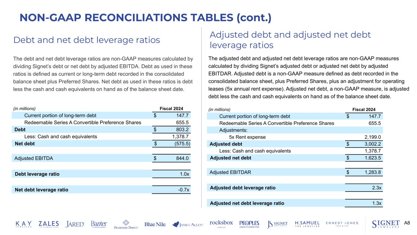 NON-GAAP RECONCILIATIONS TABLES (cont.) Debt and net debt leverage ratios The debt and net debt leverage ratios are non-GAAP measures calculated by dividing Signet’s debt or net debt by adjusted EBITDA. Debt as used in these ratios is defined as current or long-term debt recorded in the consolidated balance sheet plus Preferred Shares. Net debt as used in these ratios is debt less the cash and cash equivalents on hand as of the balance sheet date. Adjusted debt and adjusted net debt leverage ratios The adjusted debt and adjusted net debt leverage ratios are non-GAAP measures calculated by dividing Signet’s adjusted debt or adjusted net debt by adjusted EBITDAR. Adjusted debt is a non-GAAP measure defined as debt recorded in the consolidated balance sheet, plus Preferred Shares, plus an adjustment for operating leases (5x annual rent expense). Adjusted net debt, a non-GAAP measure, is adjusted debt less the cash and cash equivalents on hand as of the balance sheet date. (in millions) Fiscal 2024 Current portion of long-term debt $ 147.7 Redeemable Series A Convertible Preference Shares 655.5 Adjustments: 5x Rent expense 2,199.0 Adjusted debt $ 3,002.2 Less: Cash and cash equivalents 1,378.7 Adjusted net debt $ 1,623.5 Adjusted EBITDAR $ 1,283.8 Adjusted debt leverage ratio 2.3x Adjusted net debt leverage ratio 1.3x (in millions) Fiscal 2024 Current portion of long-term debt $ 147.7 Redeemable Series A Convertible Preference Shares 655.5 Debt $ 803.2 Less: Cash and cash equivalents 1,378.7 Net debt $ (575.5) Adjusted EBITDA $ 844.0 Debt leverage ratio 1.0x Net debt leverage ratio -0.7x A8