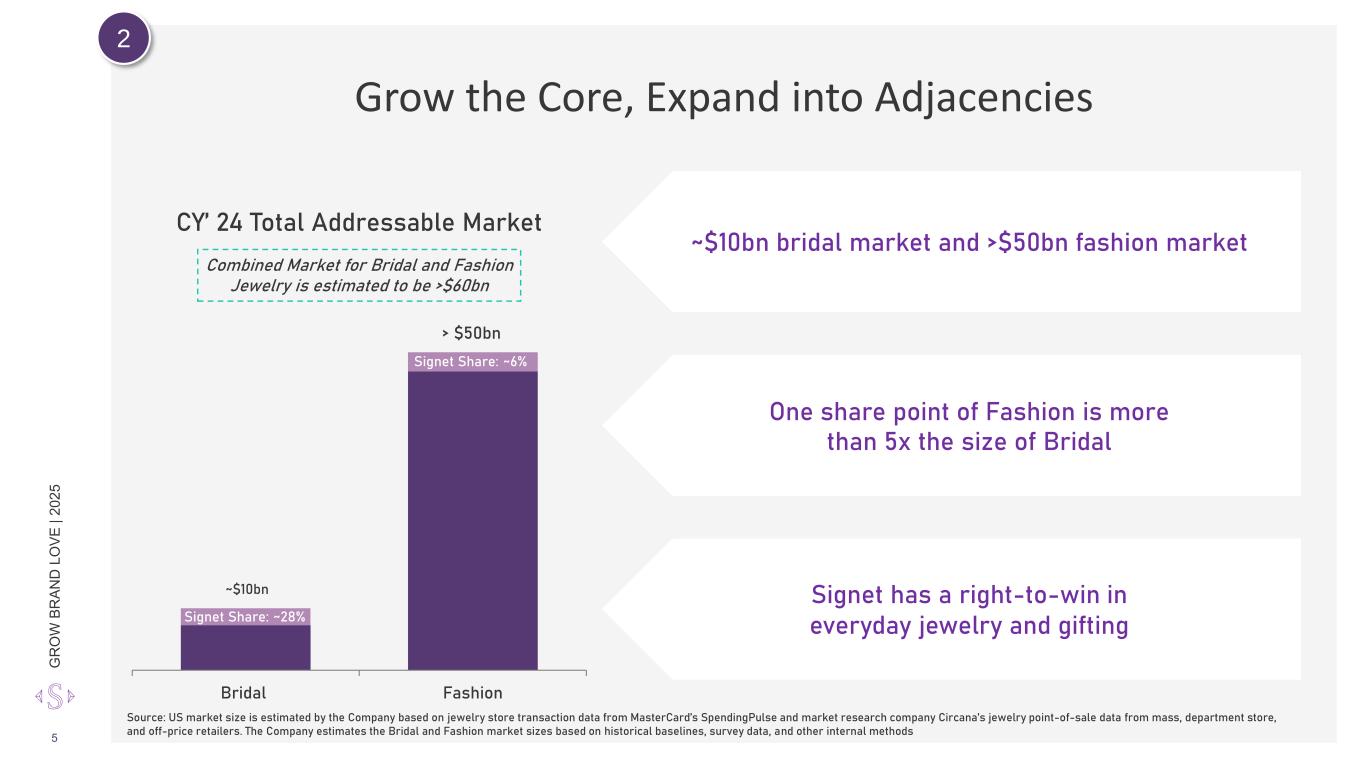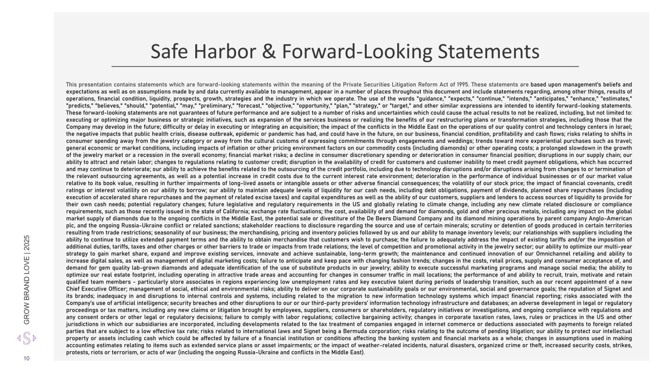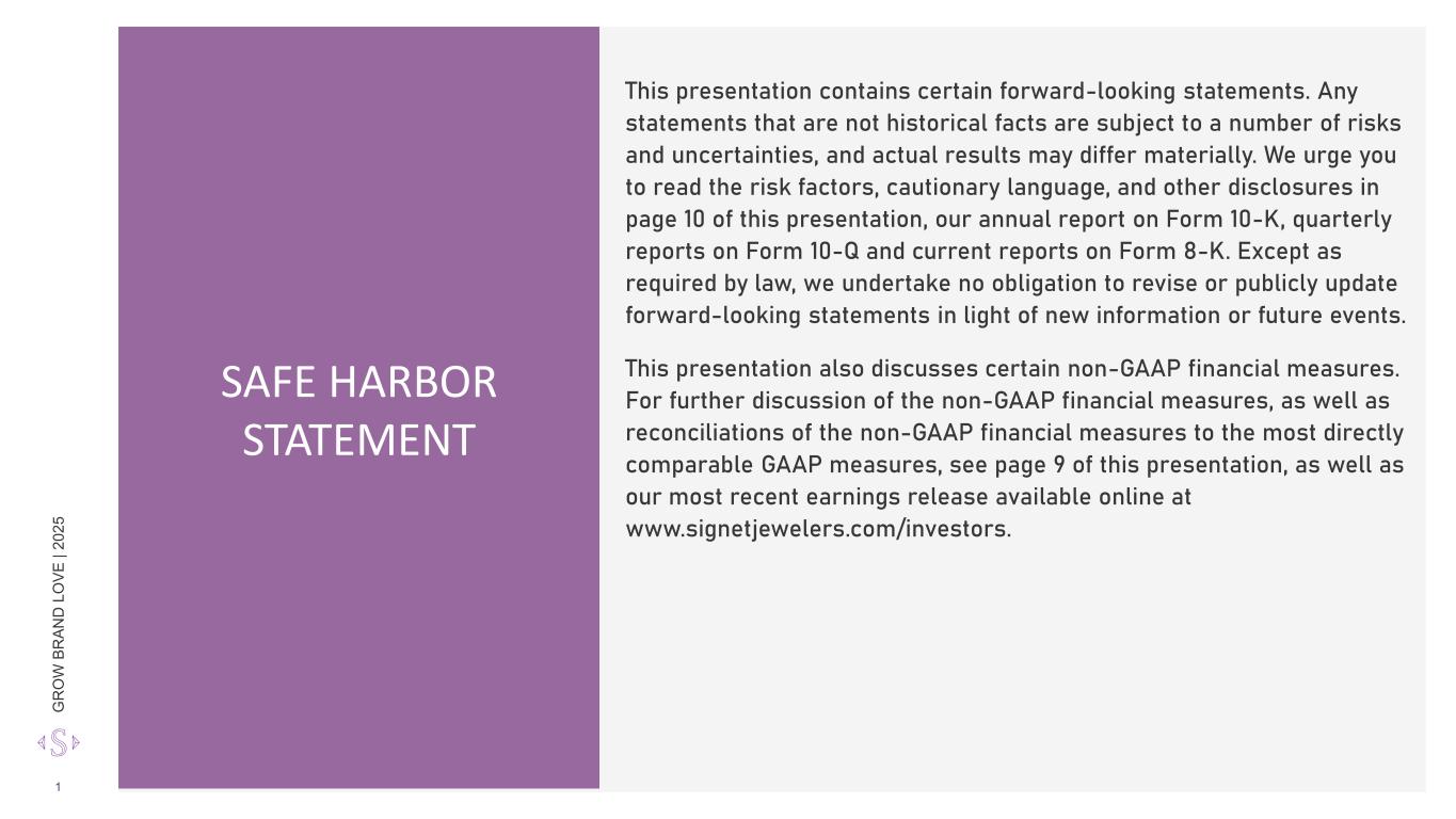 G R O W B R A N D L O V E | 2 0 2 5 This presentation contains certain forward-looking statements. Any statements that are not historical facts are subject to a number of risks and uncertainties, and actual results may differ materially. We urge you to read the risk factors, cautionary language, and other disclosures in page 10 of this presentation, our annual report on Form 10-K, quarterly reports on Form 10-Q and current reports on Form 8-K. Except as required by law, we undertake no obligation to revise or publicly update forward-looking statements in light of new information or future events. This presentation also discusses certain non-GAAP financial measures. For further discussion of the non-GAAP financial measures, as well as reconciliations of the non-GAAP financial measures to the most directly comparable GAAP measures, see page 9 of this presentation, as well as our most recent earnings release available online at www.signetjewelers.com/investors. SAFE HARBOR STATEMENT 1