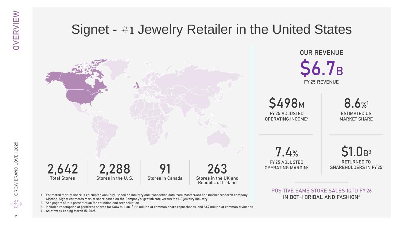 G R O W B R A N D L O V E | 2 0 2 5 O V E R V IE W OUR REVENUE $6.7B FY’25 REVENUE $498M FY’25 ADJUSTED OPERATING INCOME2 8.6%1 ESTIMATED US MARKET SHARE 7.4% FY’25 ADJUSTED OPERATING MARGIN2 $1.0B3 RETURNED TO SHAREHOLDERS IN FY’25 2 POSITIVE SAME STORE SALES 1QTD FY’26 IN BOTH BRIDAL AND FASHION4 2,642 Total Stores 263 Stores in the UK and Republic of Ireland 2,288 Stores in the U. S. 91 Stores in Canada Signet - #1 Jewelry Retailer in the United States 1. Estimated market share is calculated annually. Based on industry and transaction data from MasterCard and market research company Circana, Signet estimates market share based on the Company’s growth rate versus the US jewelry industry 2. See page 9 of this presentation for definition and reconciliation 3. Includes redemption of preferred shares for $814 million, $138 million of common share repurchases, and $49 million of common dividends 4. As of week ending March 15, 2025