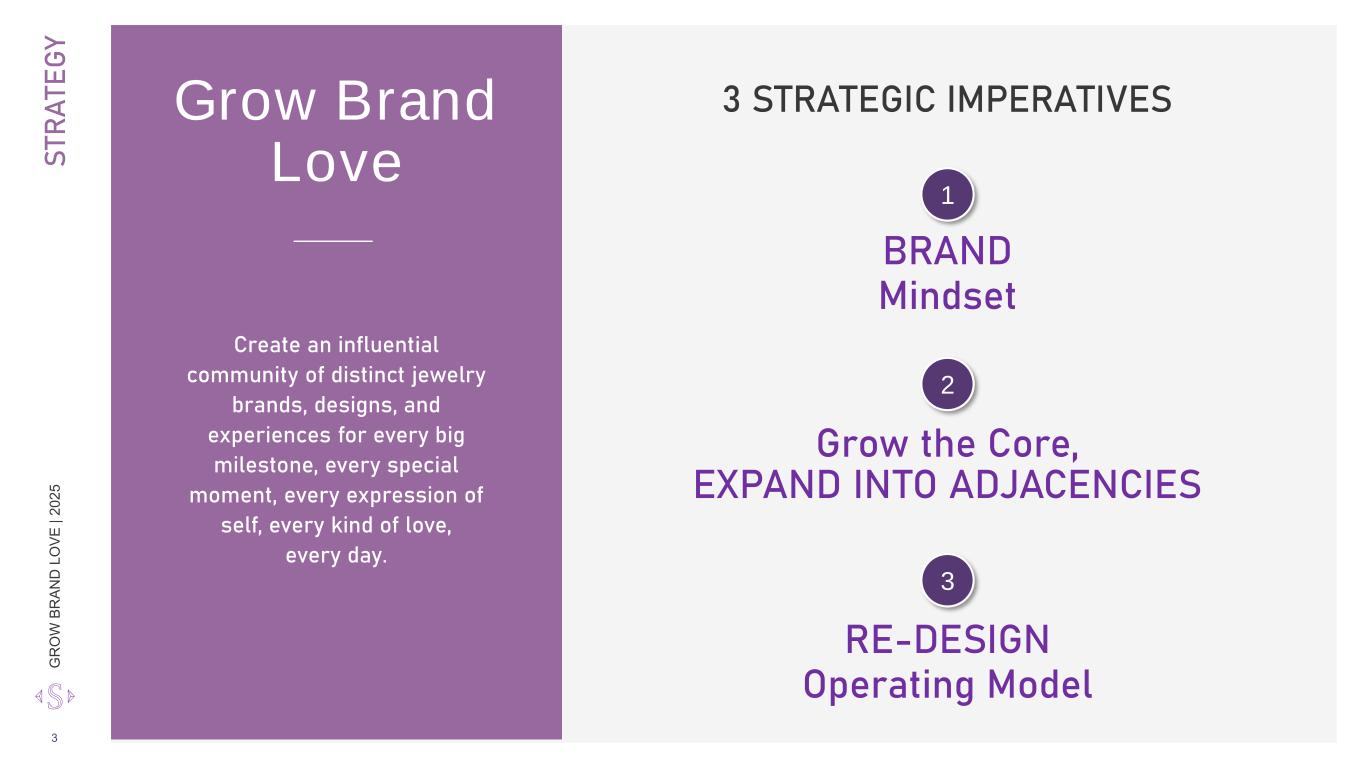 G R O W B R A N D L O V E | 2 0 2 5 S TR A T E G Y 3 Grow Brand Love Create an influential community of distinct jewelry brands, designs, and experiences for every big milestone, every special moment, every expression of self, every kind of love, every day. 3 STRATEGIC IMPERATIVES RE-DESIGN Operating Model 3 Grow the Core, EXPAND INTO ADJACENCIES 2 BRAND Mindset 1
