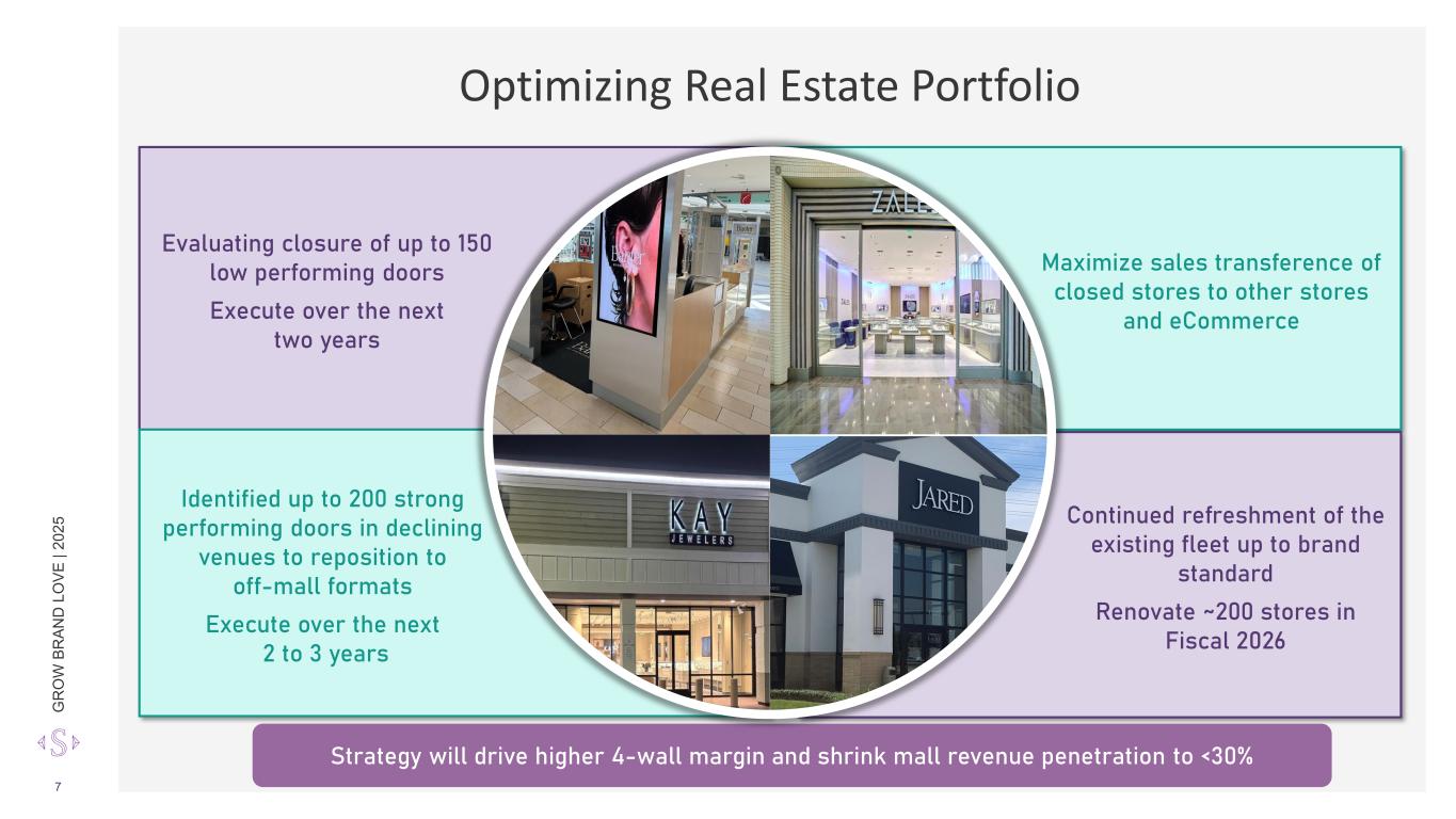 G R O W B R A N D L O V E | 2 0 2 5 Re-Designing Our Operating Model • Organizing brands to focus on customer needs and preferences • Centralizing the leadership and operation of Signet’s brands into four distinct categories  Core Milestone & Romantic Gifting Jewelry: Kay, Peoples  Style & Trend: Zales, Banter  Inspired Luxury: Jared, Diamonds Direct  Digital Pure Play: Blue Nile, James Allen, Rocksbox • Moving to a brand-specific structure to improve efficiencies and speed of decision-making • Enable each brand to sharply identify and deliver a more distinct experience for their customers • Centralization enables delivery of benefits at scale for media buying, core basic merchandising and sourcing functions, Services and integrated Digital and IT functions • Allows for brands to focus on creative design, product assortment, and captivating experiences Driving meaningful simplification, increasing accountability, bringing us closer to consumers, and realizing scale advantages. Simplifying Brand Portfolio and Services Centralizing Select Functions Reorganizing Store Operations 3 6