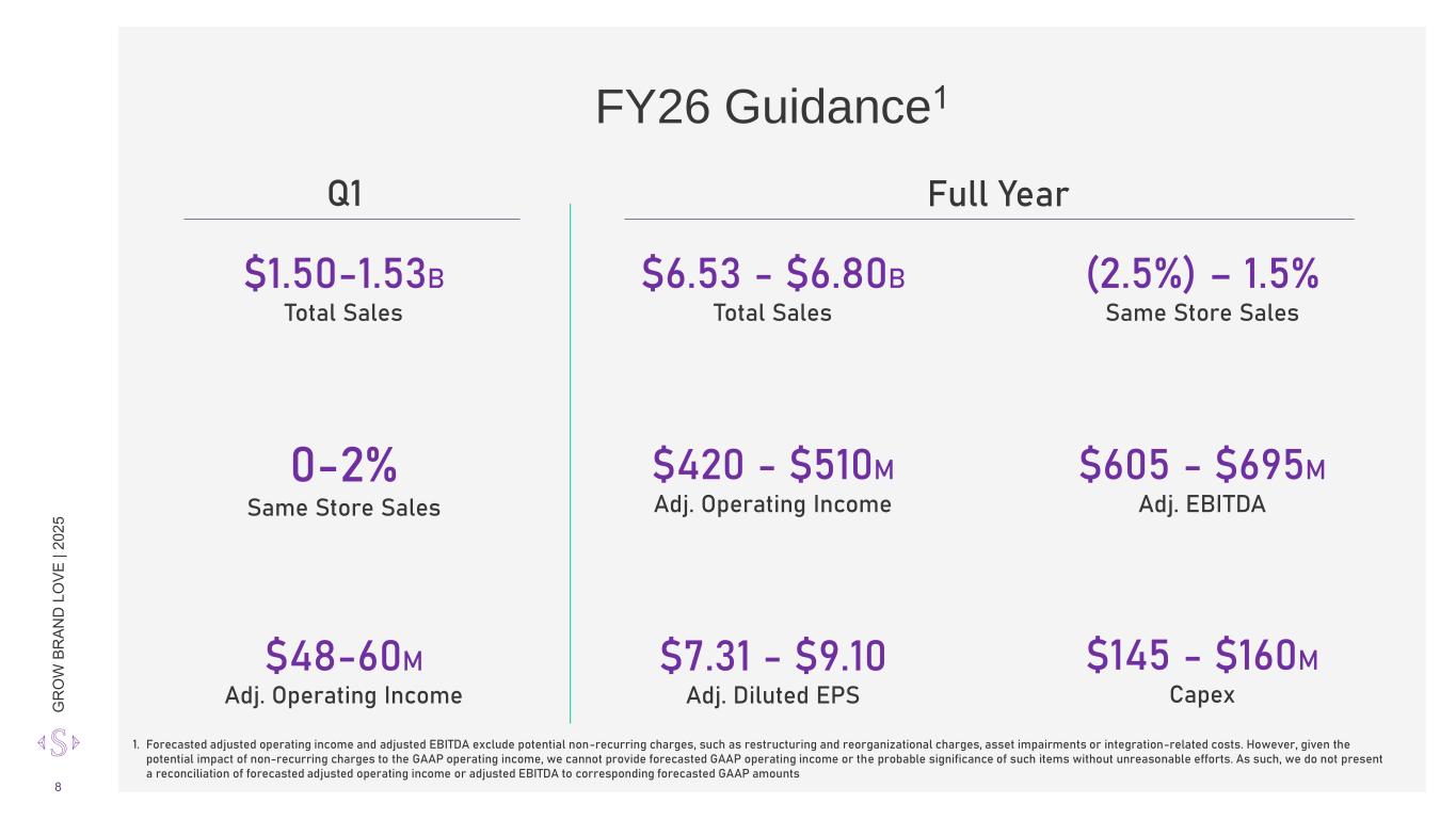 G R O W B R A N D L O V E | 2 0 2 5 $48-60M Adj. Operating Income 0-2% Same Store Sales $1.50-1.53B Total Sales 8 $6.53 - $6.80B Total Sales (2.5%) – 1.5% Same Store Sales $420 - $510M Adj. Operating Income $605 - $695M Adj. EBITDA $7.31 - $9.10 Adj. Diluted EPS $145 - $160M Capex 1. Forecasted adjusted operating income and adjusted EBITDA exclude potential non-recurring charges, such as restructuring and reorganizational charges, asset impairments or integration-related costs. However, given the potential impact of non-recurring charges to the GAAP operating income, we cannot provide forecasted GAAP operating income or the probable significance of such items without unreasonable efforts. As such, we do not present a reconciliation of forecasted adjusted operating income or adjusted EBITDA to corresponding forecasted GAAP amounts Q1 FY26 Guidance1 Full Year
