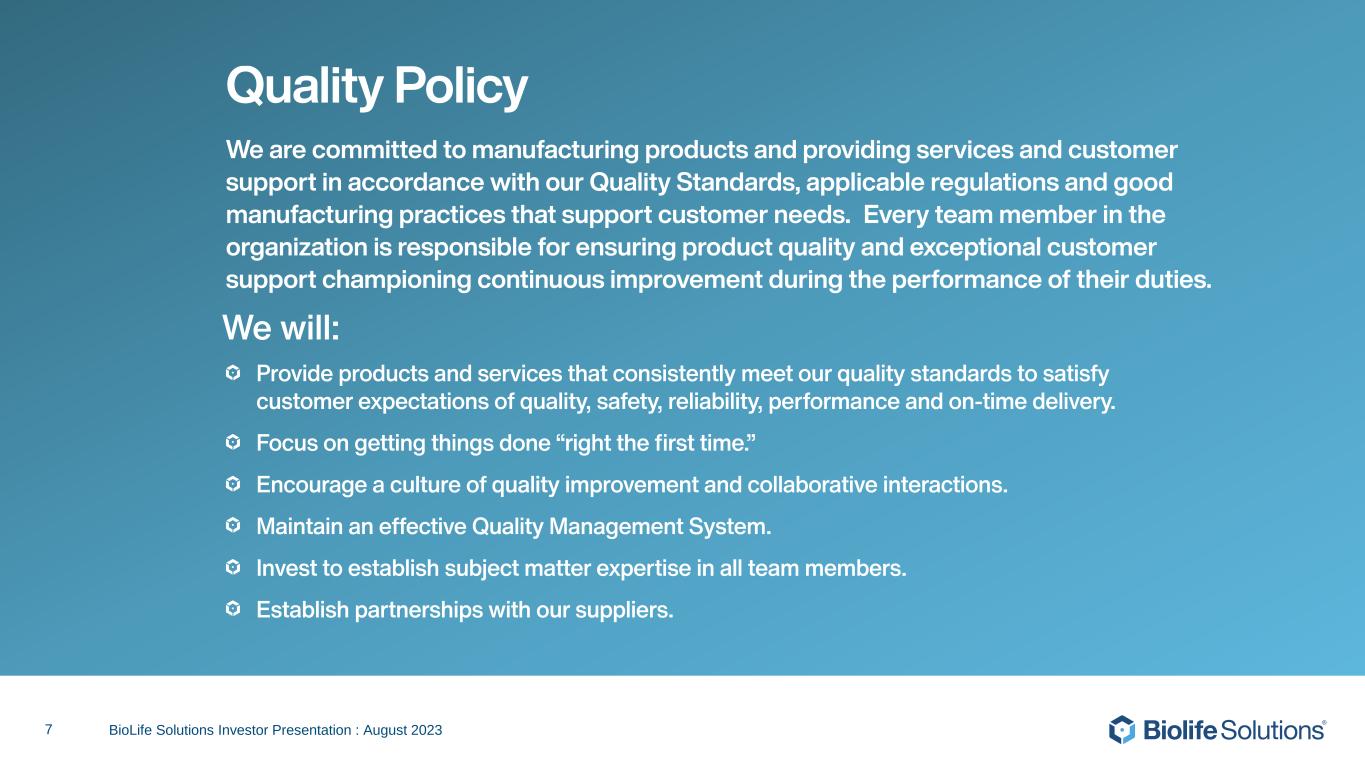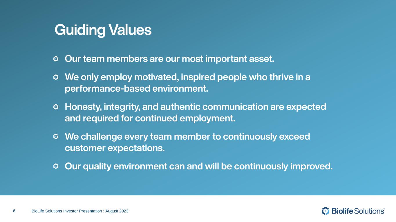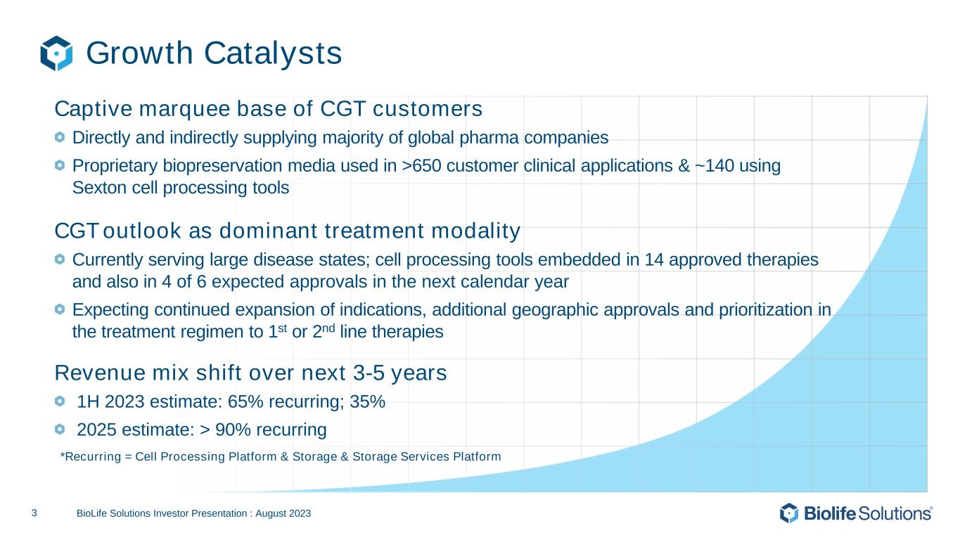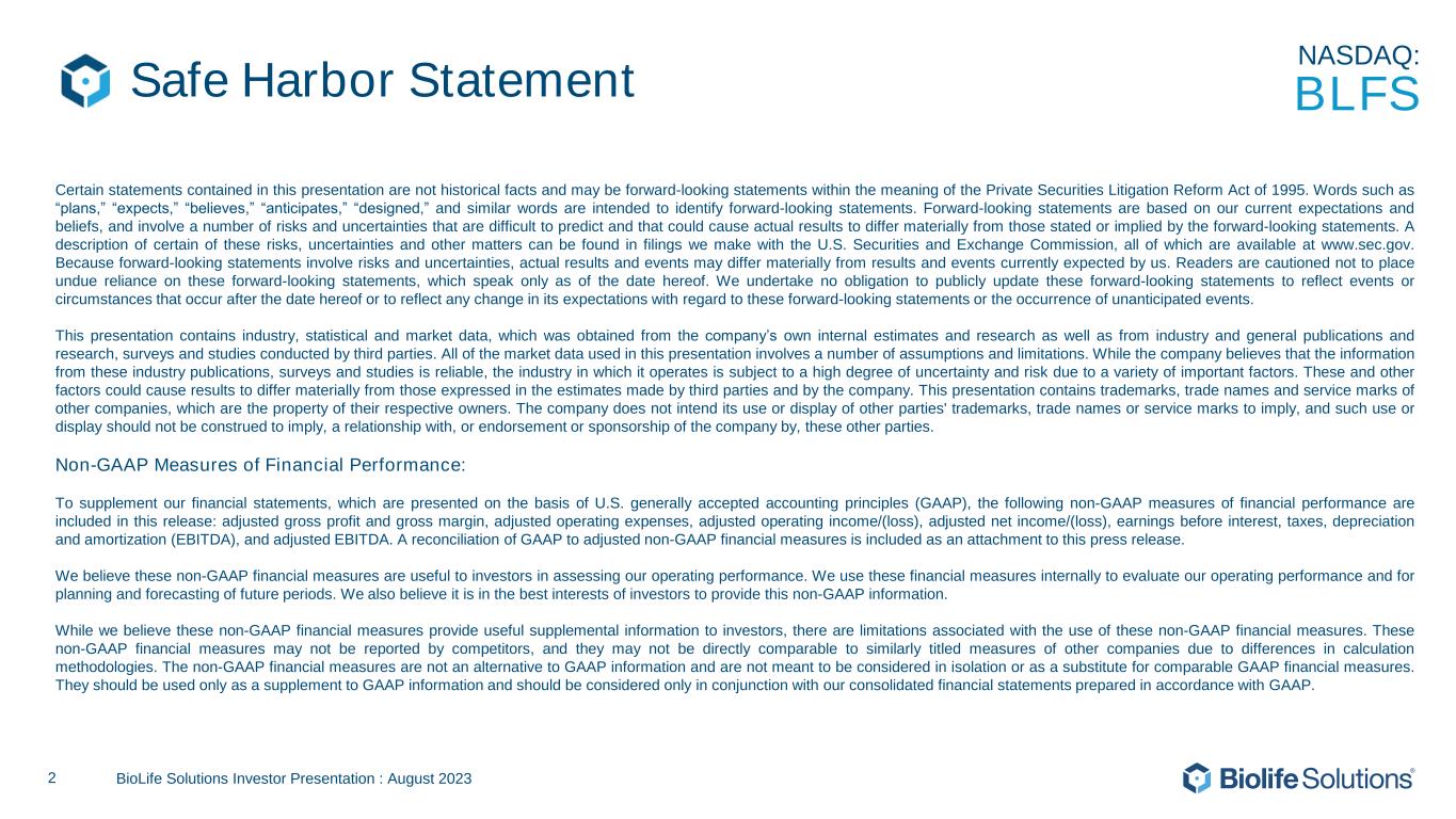 BioLife Solutions Investor Presentation : August 20232 Safe Harbor Statement NASDAQ: BLFS Certain statements contained in this presentation are not historical facts and may be forward-looking statements within the meaning of the Private Securities Litigation Reform Act of 1995. Words such as “plans,” “expects,” “believes,” “anticipates,” “designed,” and similar words are intended to identify forward-looking statements. Forward-looking statements are based on our current expectations and beliefs, and involve a number of risks and uncertainties that are difficult to predict and that could cause actual results to differ materially from those stated or implied by the forward-looking statements. A description of certain of these risks, uncertainties and other matters can be found in filings we make with the U.S. Securities and Exchange Commission, all of which are available at www.sec.gov. Because forward-looking statements involve risks and uncertainties, actual results and events may differ materially from results and events currently expected by us. Readers are cautioned not to place undue reliance on these forward-looking statements, which speak only as of the date hereof. We undertake no obligation to publicly update these forward-looking statements to reflect events or circumstances that occur after the date hereof or to reflect any change in its expectations with regard to these forward-looking statements or the occurrence of unanticipated events. This presentation contains industry, statistical and market data, which was obtained from the company’s own internal estimates and research as well as from industry and general publications and research, surveys and studies conducted by third parties. All of the market data used in this presentation involves a number of assumptions and limitations. While the company believes that the information from these industry publications, surveys and studies is reliable, the industry in which it operates is subject to a high degree of uncertainty and risk due to a variety of important factors. These and other factors could cause results to differ materially from those expressed in the estimates made by third parties and by the company. This presentation contains trademarks, trade names and service marks of other companies, which are the property of their respective owners. The company does not intend its use or display of other parties' trademarks, trade names or service marks to imply, and such use or display should not be construed to imply, a relationship with, or endorsement or sponsorship of the company by, these other parties. Non-GAAP Measures of Financial Performance: To supplement our financial statements, which are presented on the basis of U.S. generally accepted accounting principles (GAAP), the following non-GAAP measures of financial performance are included in this release: adjusted gross profit and gross margin, adjusted operating expenses, adjusted operating income/(loss), adjusted net income/(loss), earnings before interest, taxes, depreciation and amortization (EBITDA), and adjusted EBITDA. A reconciliation of GAAP to adjusted non-GAAP financial measures is included as an attachment to this press release. We believe these non-GAAP financial measures are useful to investors in assessing our operating performance. We use these financial measures internally to evaluate our operating performance and for planning and forecasting of future periods. We also believe it is in the best interests of investors to provide this non-GAAP information. While we believe these non-GAAP financial measures provide useful supplemental information to investors, there are limitations associated with the use of these non-GAAP financial measures. These non-GAAP financial measures may not be reported by competitors, and they may not be directly comparable to similarly titled measures of other companies due to differences in calculation methodologies. The non-GAAP financial measures are not an alternative to GAAP information and are not meant to be considered in isolation or as a substitute for comparable GAAP financial measures. They should be used only as a supplement to GAAP information and should be considered only in conjunction with our consolidated financial statements prepared in accordance with GAAP.