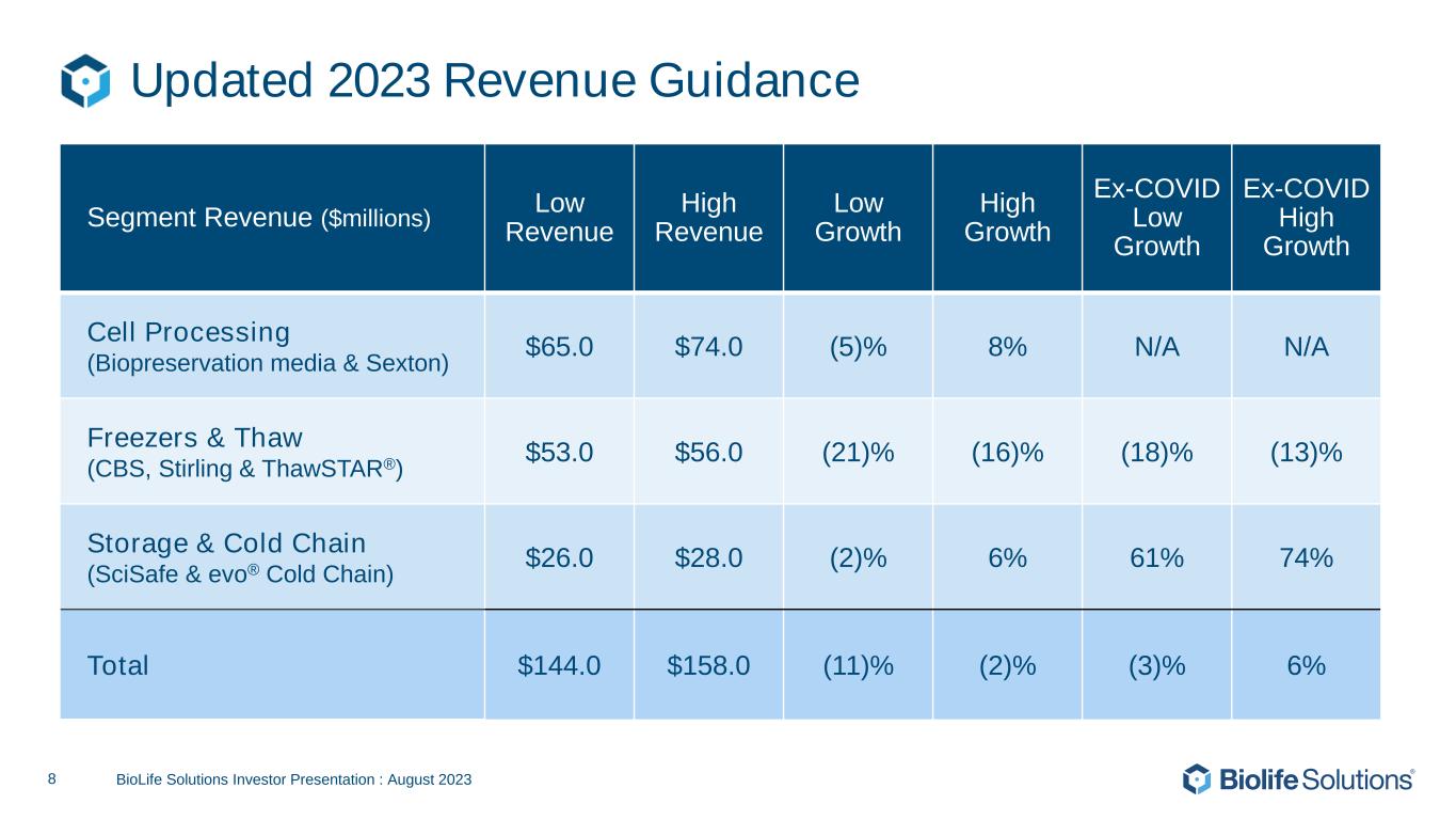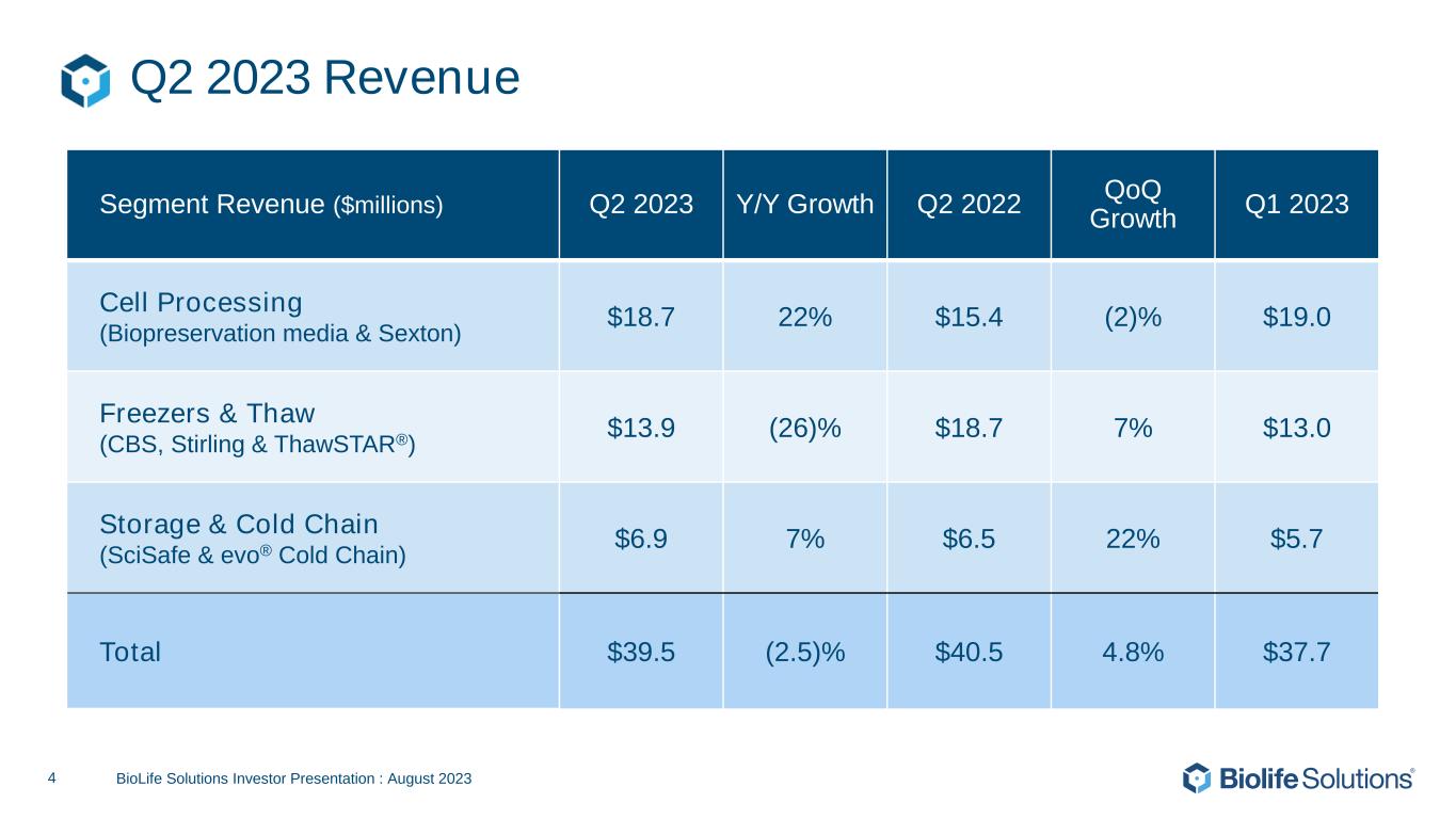 BioLife Solutions Investor Presentation : August 20234 . . . . . . . . . . . . . . . . . . . . . . . . . . . . . . . . . . . . . . . . . . . . . . . . . . . . . . . . . . . . . . . . . . . . . . . . . . . . . . . . . . . . . . . . . . . . . . . . . . . . . . . . . . . . . . . . . . . . . . . . . . . . . . . . . . . . . . . . . . . . . . . . . . . . . . . . . . . . . . . . . . . . . . . . . . . . . . . . . . . . . . . . . . . . . . . . . . . . . . . . . . . . . . . . . . . . . . . . . . . . . Synergies Q2 2023 Revenue Segment Revenue ($millions) Q2 2023 Y/Y Growth Q2 2022 QoQ Growth Q1 2023 Cell Processing (Biopreservation media & Sexton) $18.7 22% $15.4 (2)% $19.0 Freezers & Thaw (CBS, Stirling & ThawSTAR®) $13.9 (26)% $18.7 7% $13.0 Storage & Cold Chain (SciSafe & evo® Cold Chain) $6.9 7% $6.5 22% $5.7 Total $39.5 (2.5)% $40.5 4.8% $37.7