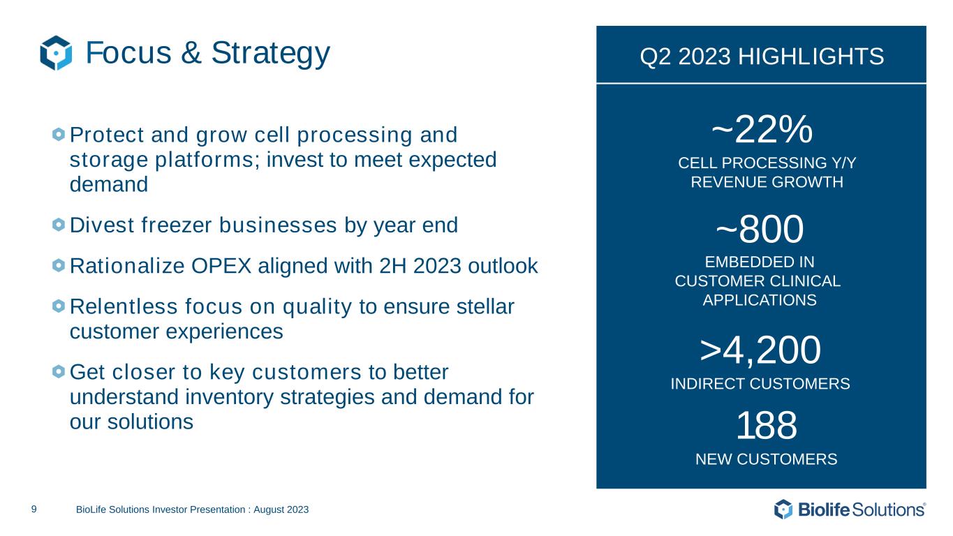 BioLife Solutions Investor Presentation : August 20238 Updated 2023 Revenue Guidance Segment Revenue ($millions) Low Revenue High Revenue Low Growth High Growth Ex-COVID Low Growth Ex-COVID High Growth Cell Processing (Biopreservation media & Sexton) $65.0 $74.0 (5)% 8% N/A N/A Freezers & Thaw (CBS, Stirling & ThawSTAR®) $53.0 $56.0 (21)% (16)% (18)% (13)% Storage & Cold Chain (SciSafe & evo® Cold Chain) $26.0 $28.0 (2)% 6% 61% 74% Total $144.0 $158.0 (11)% (2)% (3)% 6%