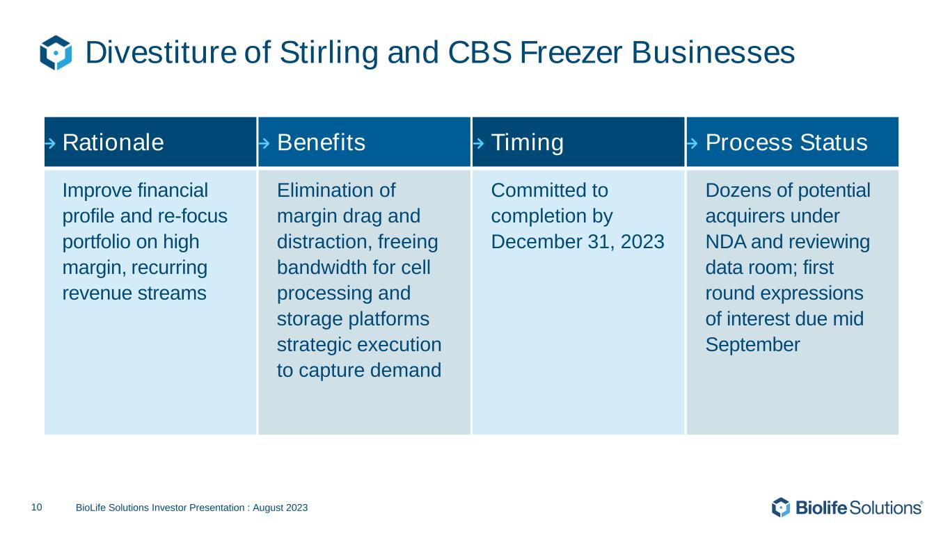 BioLife Solutions Investor Presentation : August 20239 Focus & Strategy Protect and grow cell processing and storage platforms; invest to meet expected demand Divest freezer businesses by year end Rationalize OPEX aligned with 2H 2023 outlook Relentless focus on quality to ensure stellar customer experiences Get closer to key customers to better understand inventory strategies and demand for our solutions Q2 2023 HIGHLIGHTS ~22% CELL PROCESSING Y/Y REVENUE GROWTH ~800 EMBEDDED IN CUSTOMER CLINICAL APPLICATIONS >4,200 INDIRECT CUSTOMERS 188 NEW CUSTOMERS