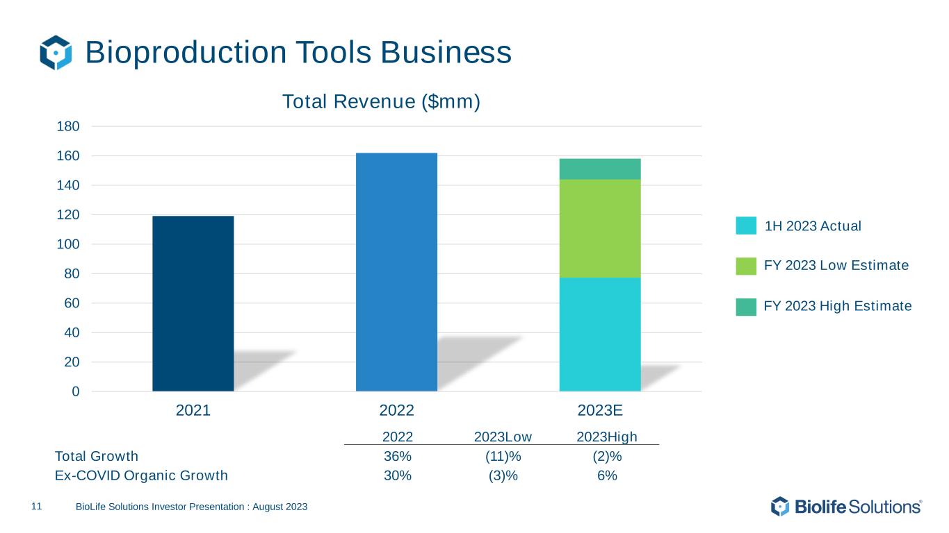 BioLife Solutions Investor Presentation : August 202310 Divestiture of Stirling and CBS Freezer Businesses Rationale Improve financial profile and re-focus portfolio on high margin, recurring revenue streams Benefits Elimination of margin drag and distraction, freeing bandwidth for cell processing and storage platforms strategic execution to capture demand Timing Committed to completion by December 31, 2023 Process Status Dozens of potential acquirers under NDA and reviewing data room; first round expressions of interest due mid September