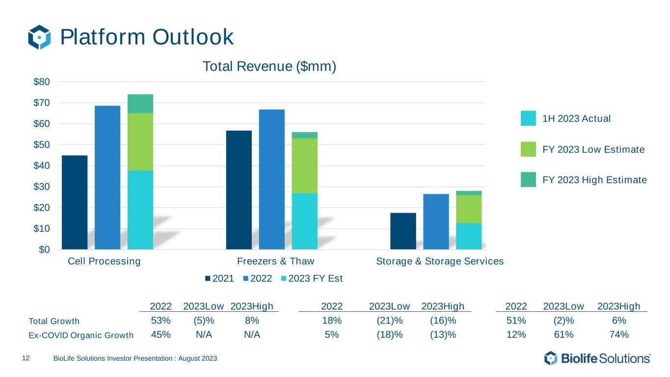 BioLife Solutions Investor Presentation : August 202312 $0 $10 $20 $30 $40 $50 $60 $70 $80 Cell Processing Freezers & Thaw Storage & Storage Services Total Revenue ($mm) 2021 2022 2023 FY Est Platform Outlook 2022 2023Low 2023High 2022 2023Low 2023High 2022 2023Low 2023High Total Growth 53% (5)% 8% 18% (21)% (16)% 51% (2)% 6% Ex-COVID Organic Growth 45% N/A N/A 5% (18)% (13)% 12% 61% 74% FY 2023 Low Estimate FY 2023 High Estimate 1H 2023 Actual