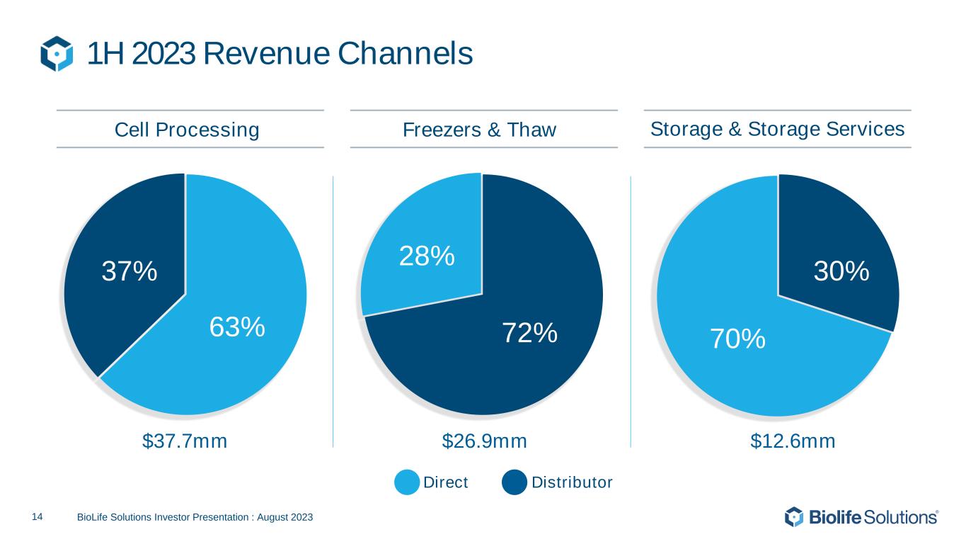 BioLife Solutions Investor Presentation : August 202314 1H 2023 Revenue Channels Cell Processing Freezers & Thaw Storage & Storage Services 63% 37% 72% 28% 30% 70% Direct Distributor $37.7mm $26.9mm $12.6mm
