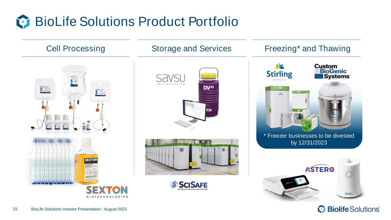 BioLife Solutions Investor Presentation : August 202315 BioLife Solutions Product Portfolio Cell Processing Storage and Services Freezing* and Thawing * Freezer businesses to be divested by 12/31/2023