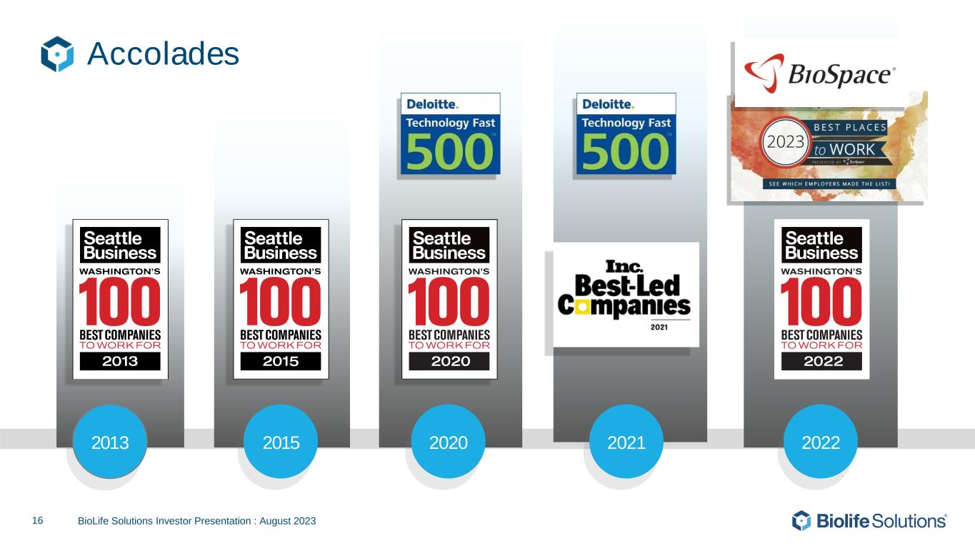 BioLife Solutions Investor Presentation : August 202316 2013 2021 Accolades 20202015 2022