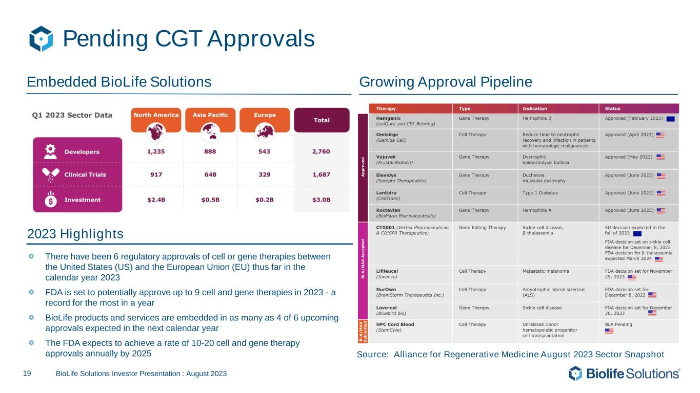 BioLife Solutions Investor Presentation : August 202318 Active Regenerative Medicine Clinical Trials Cell therapies: 46% Cell-based immuno-oncology (CBIO): 34% Gene therapies: 18% Tissue-engineered therapies: 2% Industry-sponsored: 48% Academic- and government-sponsored: 52% Source: Alliance for Regenerative Medicine 1H 2022 Report ase , ase ase nd st y on ind st y Active Clinical Trials by Sponsor and Phase Active Clinical Trials by Therapy 2022H1