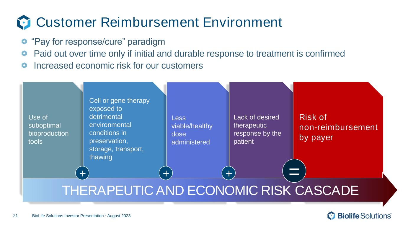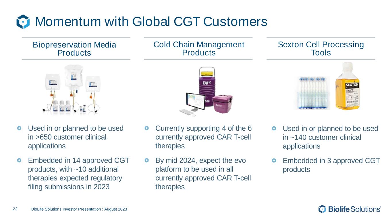 BioLife Solutions Investor Presentation : August 202321 Use of suboptimal bioproduction tools Cell or gene therapy exposed to detrimental environmental conditions in preservation, storage, transport, thawing Less viable/healthy dose administered Lack of desired therapeutic response by the patient Risk of non-reimbursement by payer THERAPEUTIC AND ECONOMIC RISK CASCADE Customer Reimbursement Environment “ ay fo esponse/c e” pa adigm Paid out over time only if initial and durable response to treatment is confirmed Increased economic risk for our customers + =+ +