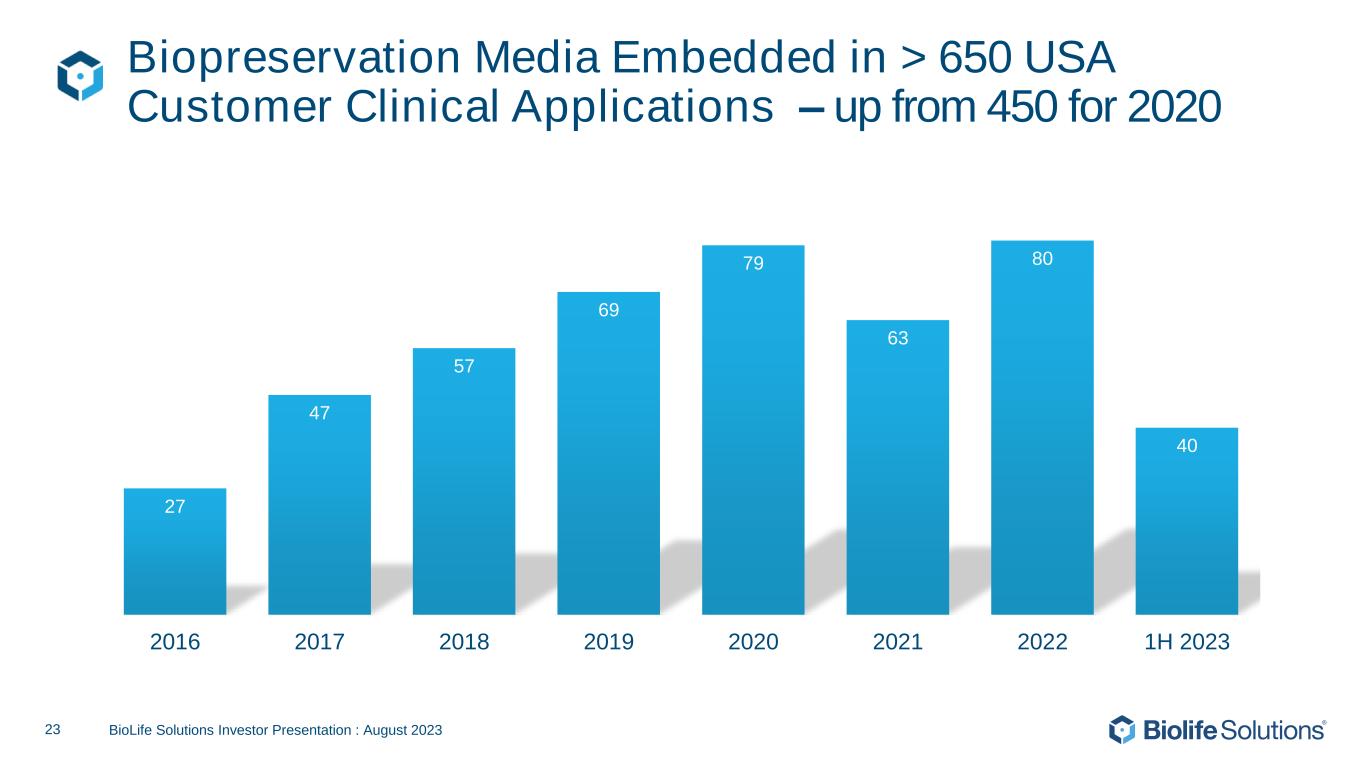 BioLife Solutions Investor Presentation : August 202323 Biopreservation Media Embedded in > 650 USA Customer Clinical Applications 27 47 57 69 79 63 80 40 2016 2017 2018 2019 2020 2021 2022 1H 2023 – up from 450 for 2020