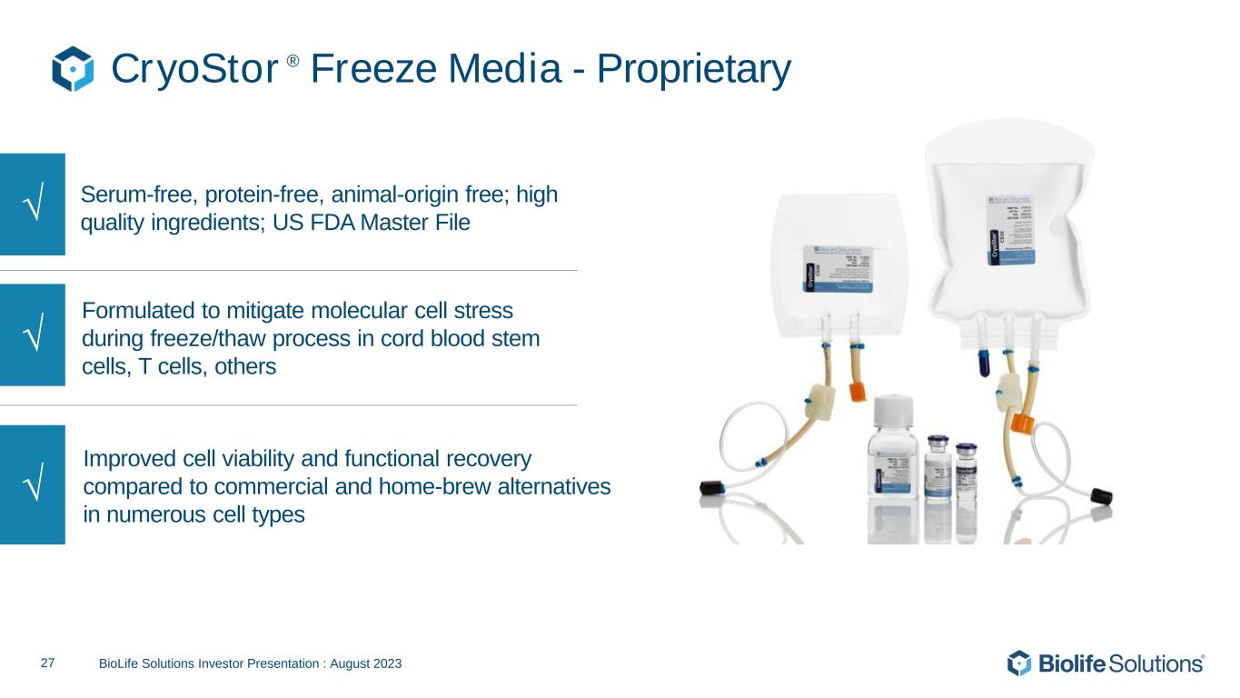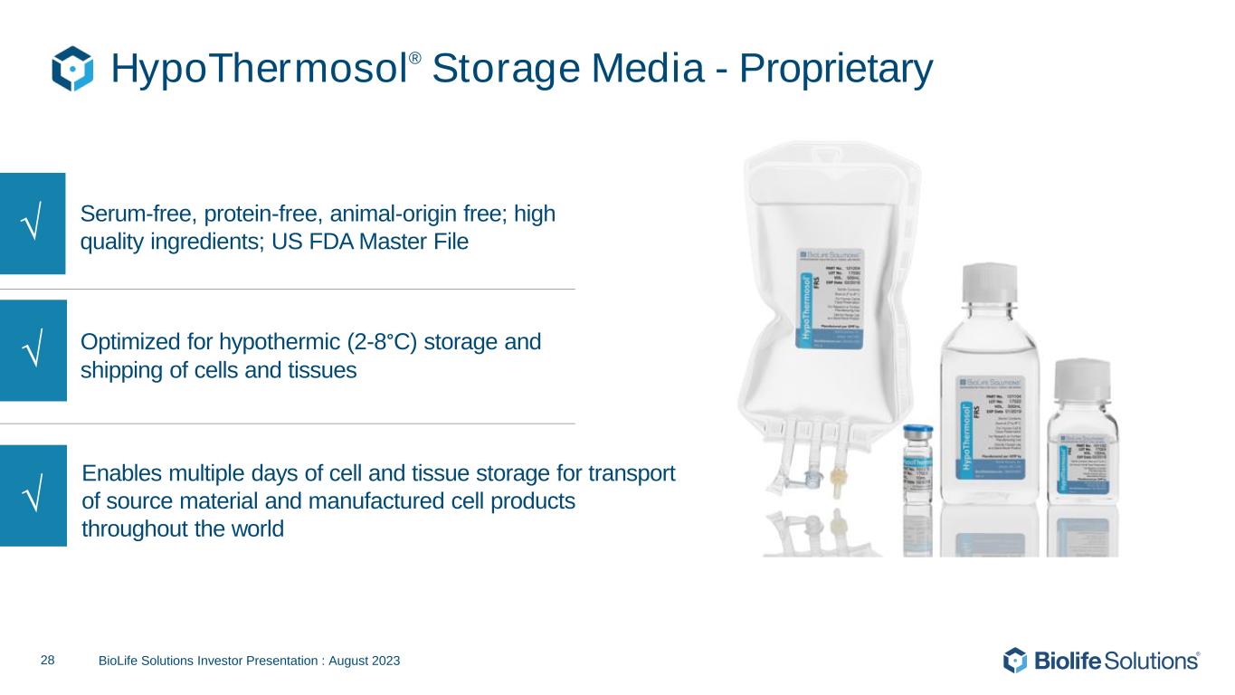 BioLife Solutions Investor Presentation : August 202327 CryoStor ® Freeze Media - Proprietary Improved cell viability and functional recovery compared to commercial and home-brew alternatives in numerous cell types Formulated to mitigate molecular cell stress during freeze/thaw process in cord blood stem cells, T cells, others Serum-free, protein-free, animal-origin free; high quality ingredients; US FDA Master File√ √ √
