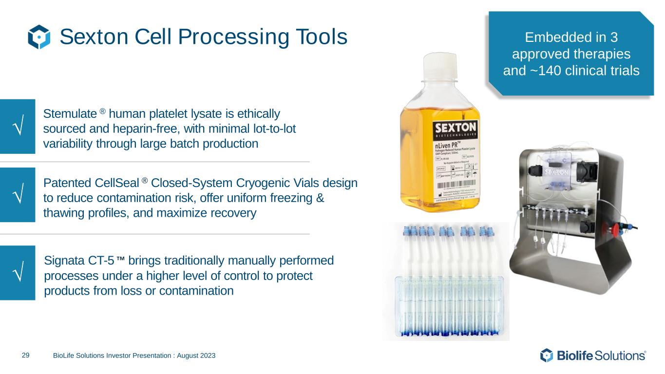 BioLife Solutions Investor Presentation : August 202328 HypoThermosol® Storage Media - Proprietary Optimized for hypothermic (2-8°C) storage and shipping of cells and tissues Enables multiple days of cell and tissue storage for transport of source material and manufactured cell products throughout the world Serum-free, protein-free, animal-origin free; high quality ingredients; US FDA Master File√ √ √