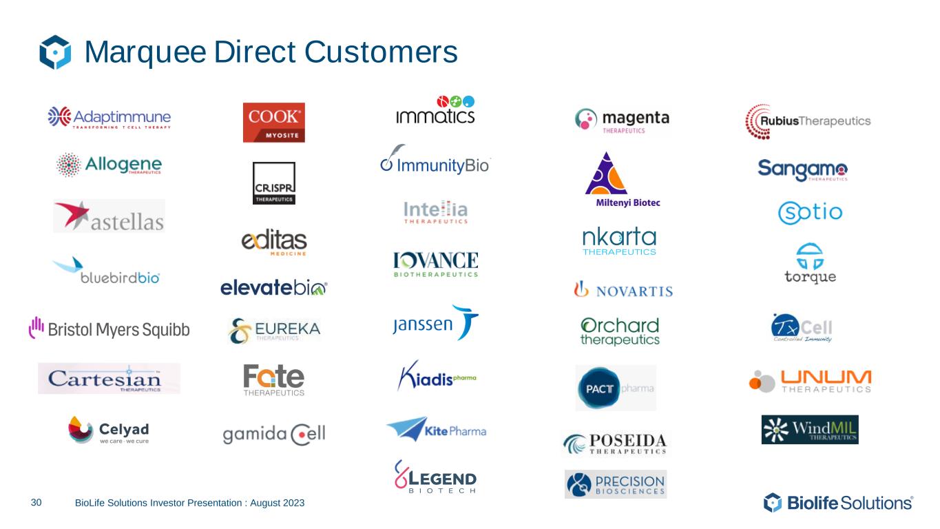 BioLife Solutions Investor Presentation : August 202330 Marquee Direct Customers