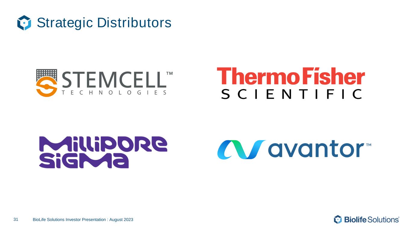 BioLife Solutions Investor Presentation : August 202331 Strategic Distributors