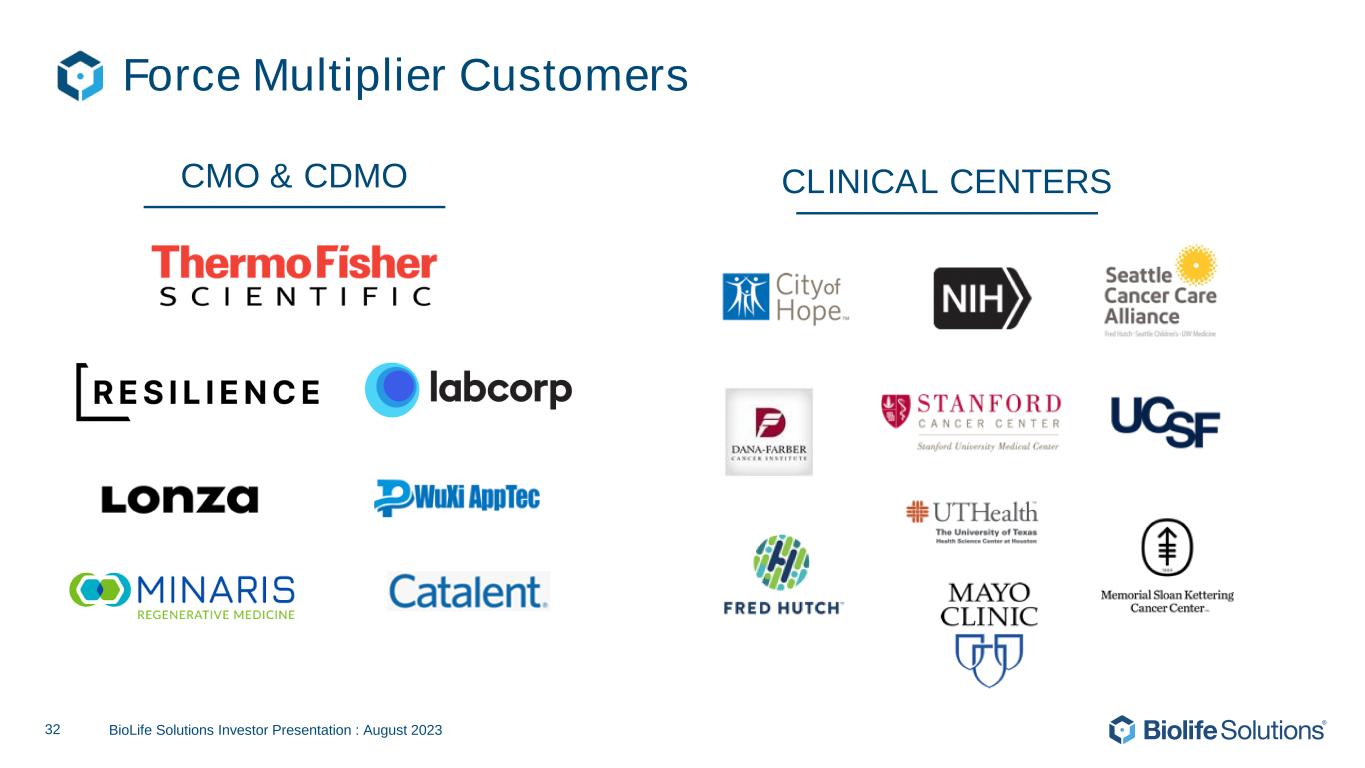 BioLife Solutions Investor Presentation : August 202332 Force Multiplier Customers CLINICAL CENTERS ————————— CMO & CDMO —————————